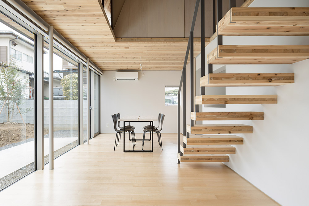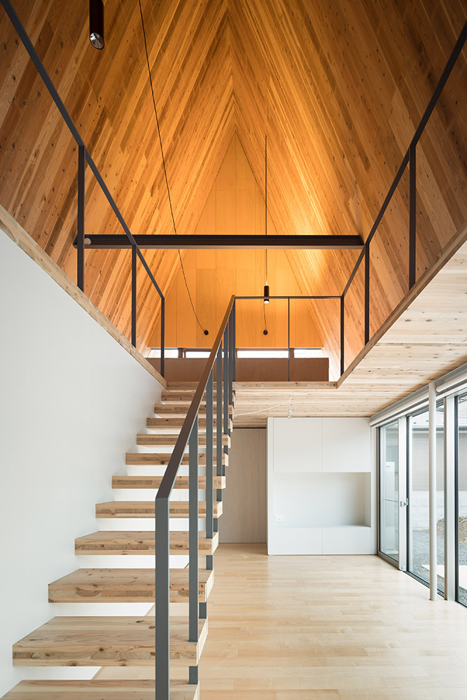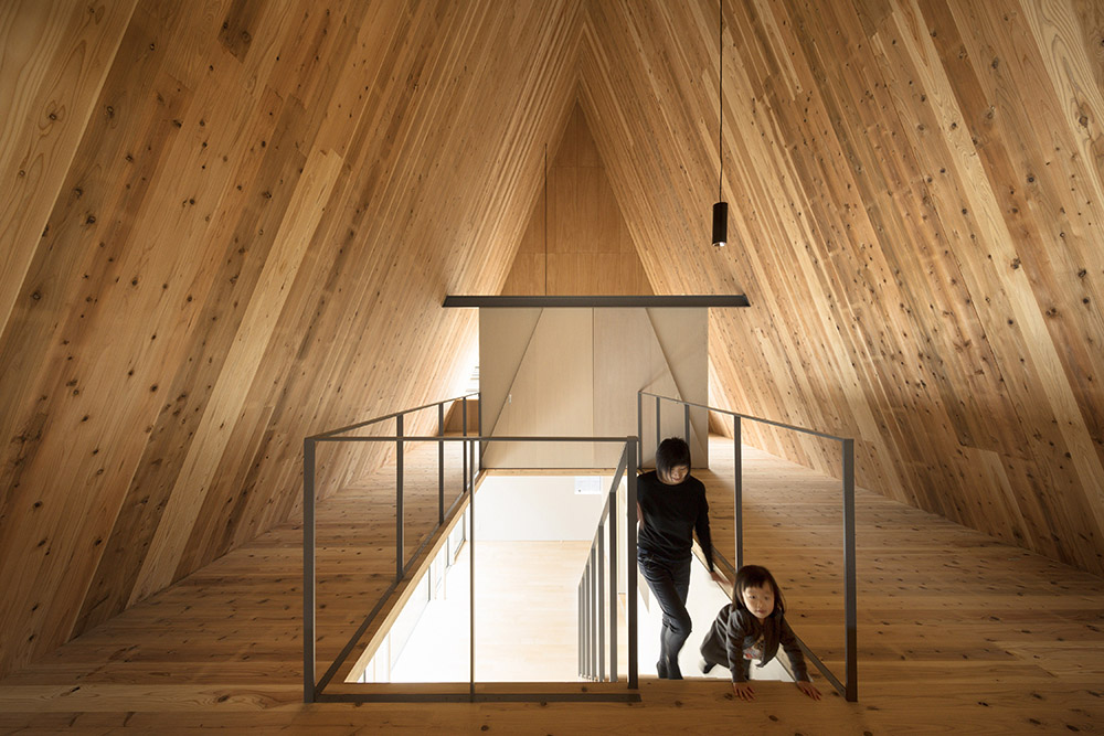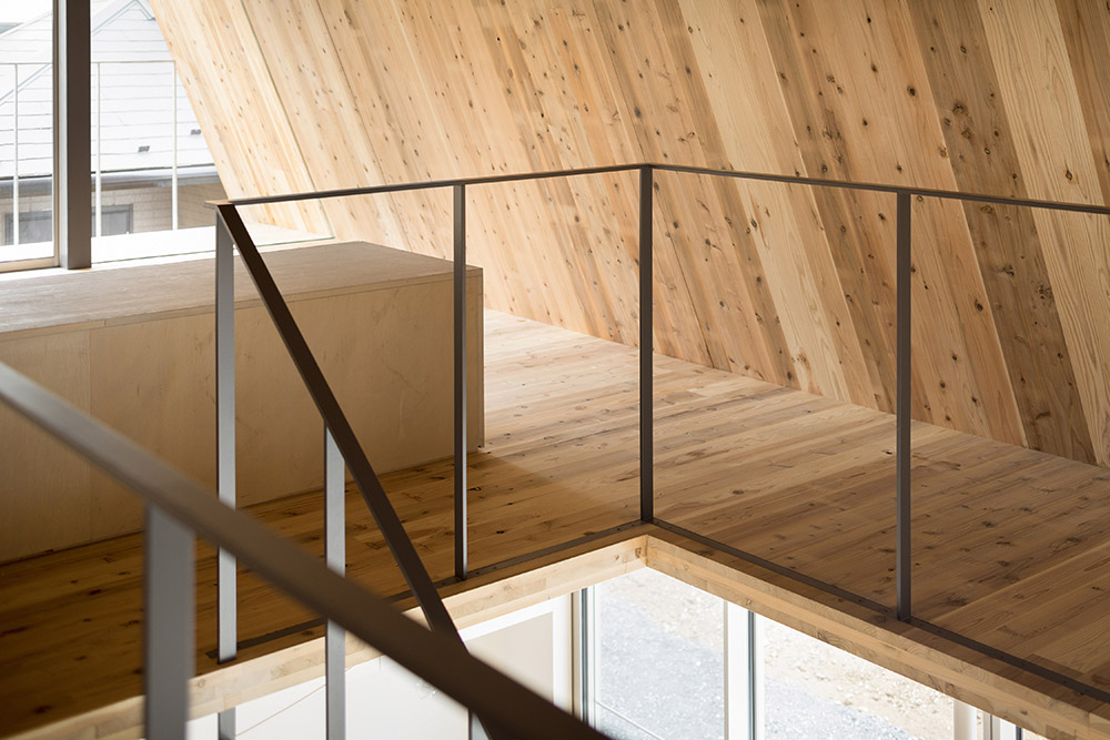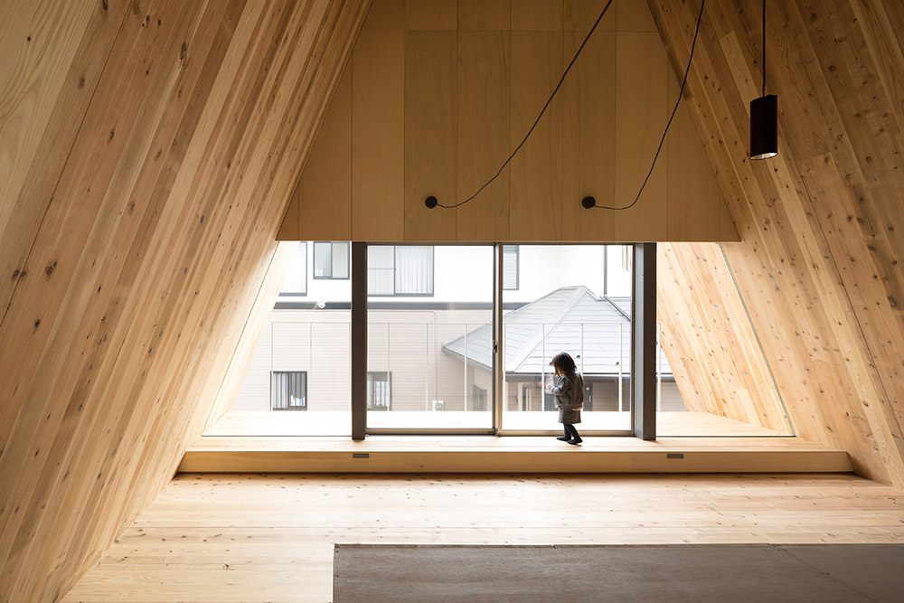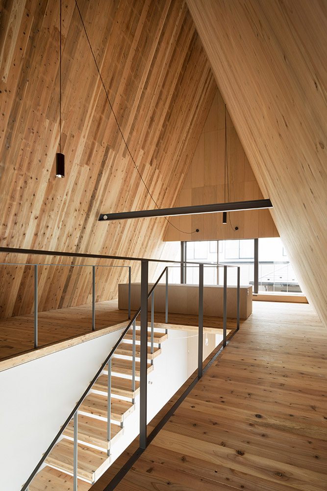 Parmi les projets d'architecture du studio aoyagi design, ce travail se distingue par sa forme triangulaire. Le prisme triangulaire est composé d'une structure en panneaux de CLT, chacun ayant une épaisseur de 90 mm. La riche texture du bois rend inutile l'installation de finitions intérieures, tout comme l'utilisation d'isolants grâce à l'épaisseur importante des panneaux.
