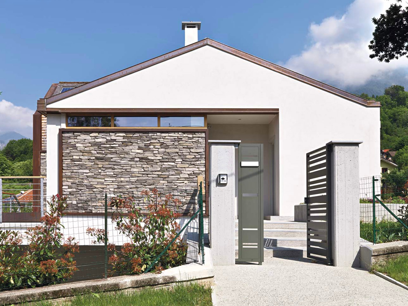 L'architetto Orazi ha selezionato diversi colori dello stesso modello di pietra per ottenere la tonalità desiderata. La scelta è ricaduta sul Profilo scagliato di Geopietra (modello Toce) caratterizzato da una posa stratificata e orizzontale con pietre allungate.  La sua valenza dichiaratamente decorativa è rafforzata dagli elementi in acciaio corten della cornice perimetrale e delle fasce decorative che riallineano visivamente le bucature asimmetriche nelle finestre.