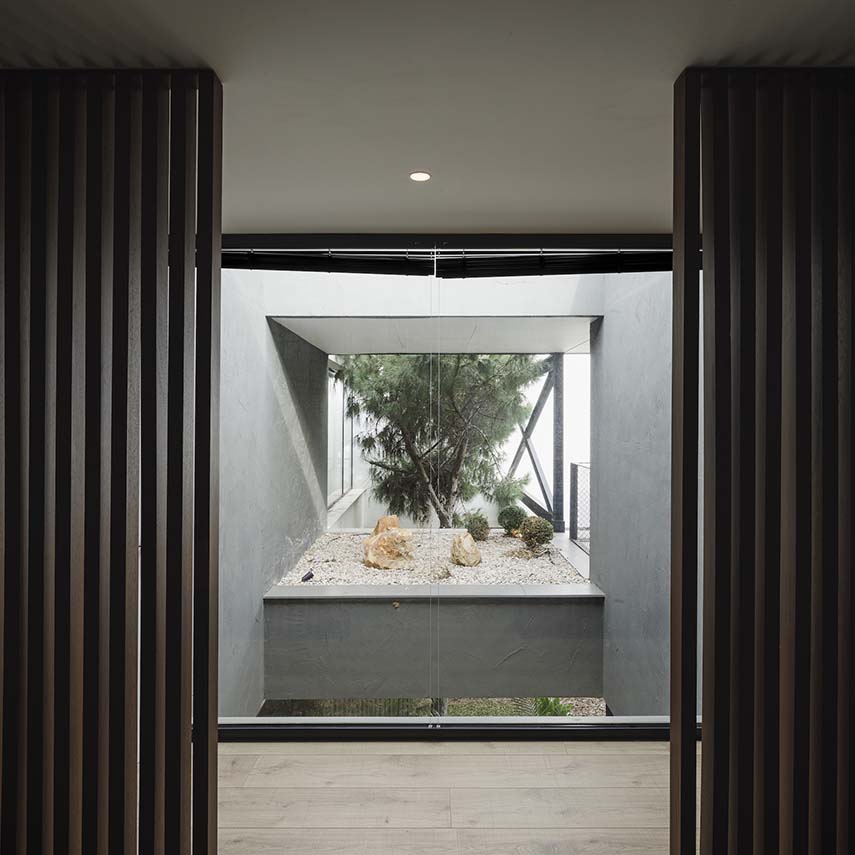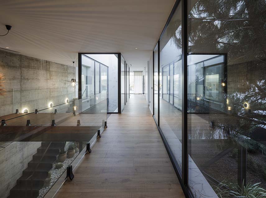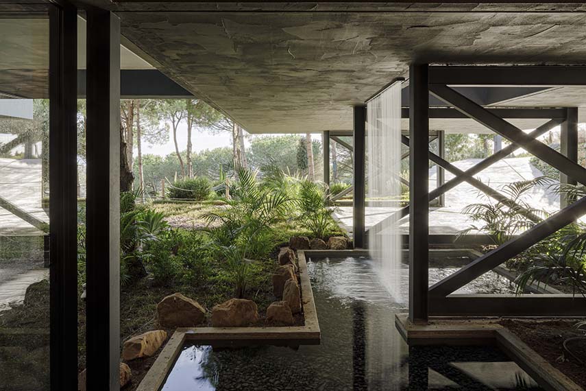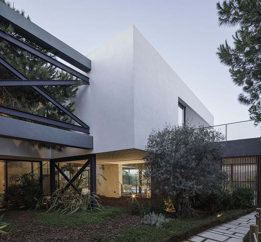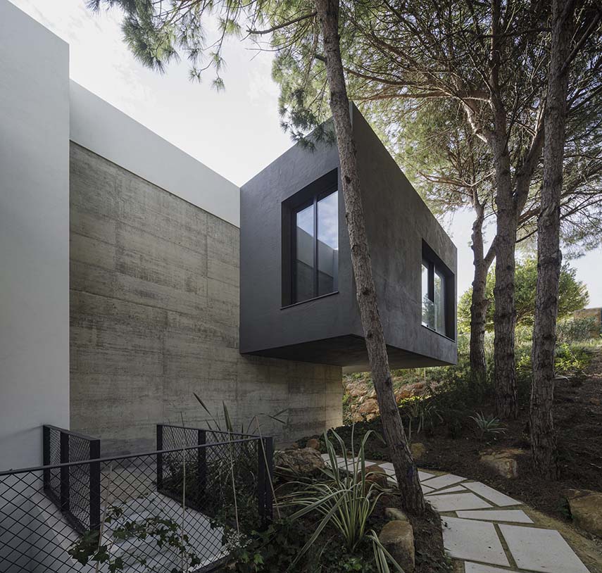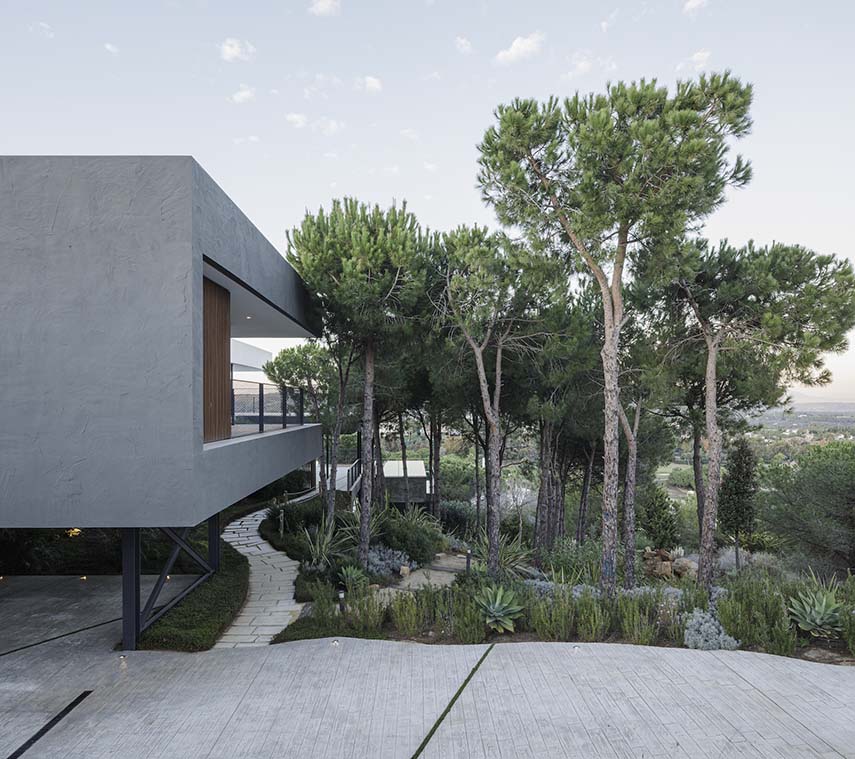Le terrain, caractérisé par une pente de 26% et 133 pins, a imposé au cabinet Flow 81 un défi de conception complexe. Pour éviter des terrassements invasifs, la villa a été conçue comme un volume surélevé sur des piliers en porte-à-faux. Cette approche a permis de préserver les racines des arbres et de créer une terrasse perforée, accueillant les cimes sans entraver leur croissance.