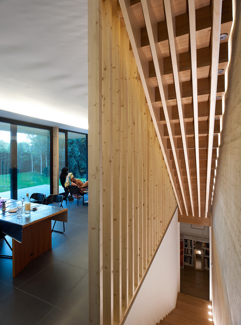 En plus des fenêtres sur la façade, un puits de lumière central assure que chaque pièce bénéficie de la lumière naturelle et de la ventilation. Enfin, lorsque une fenêtre est ouverte manuellement, l'air tempéré au niveau inférieur passe à travers la maison et le puits de lumière agit comme un système de refroidissement naturel