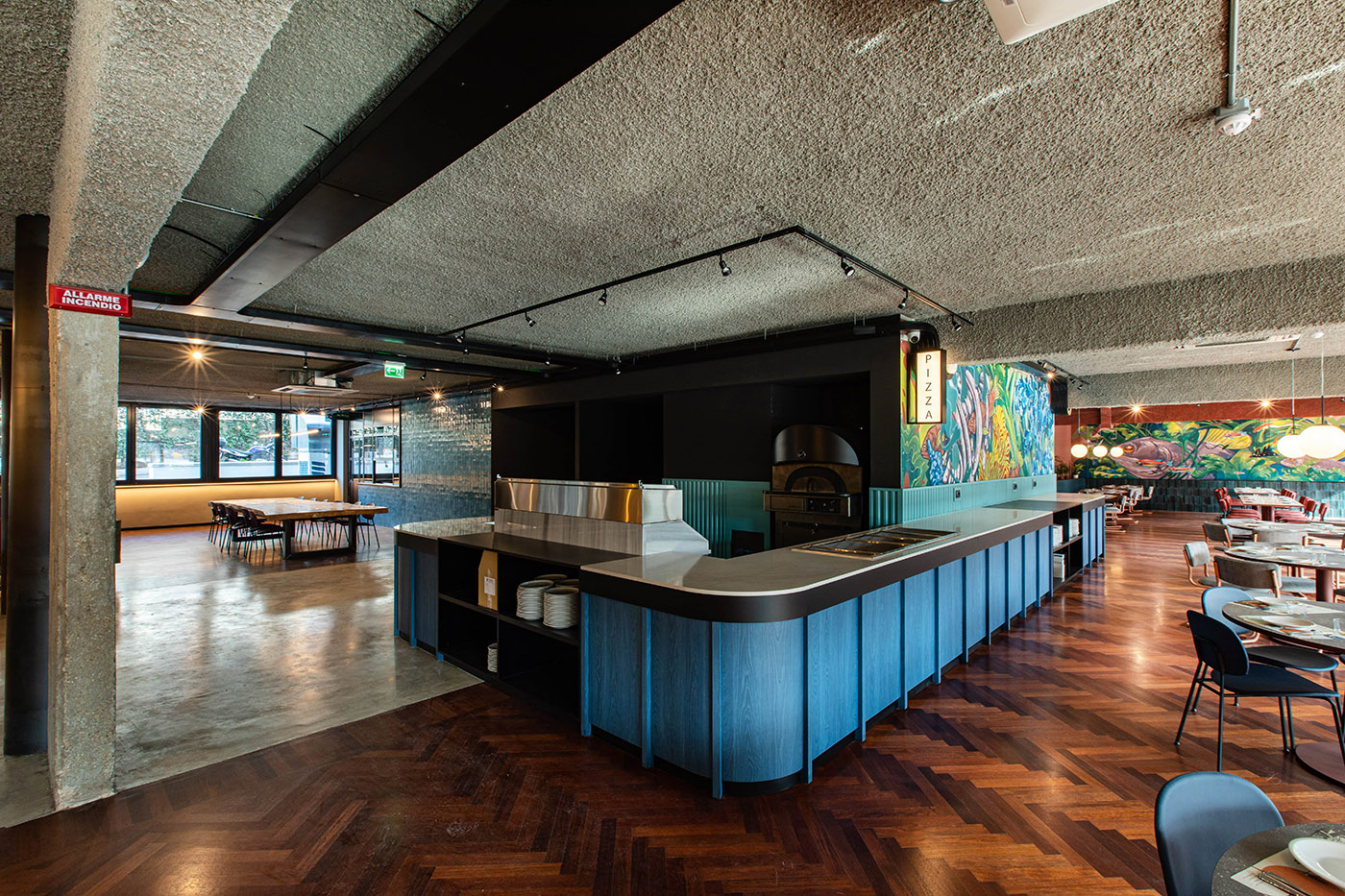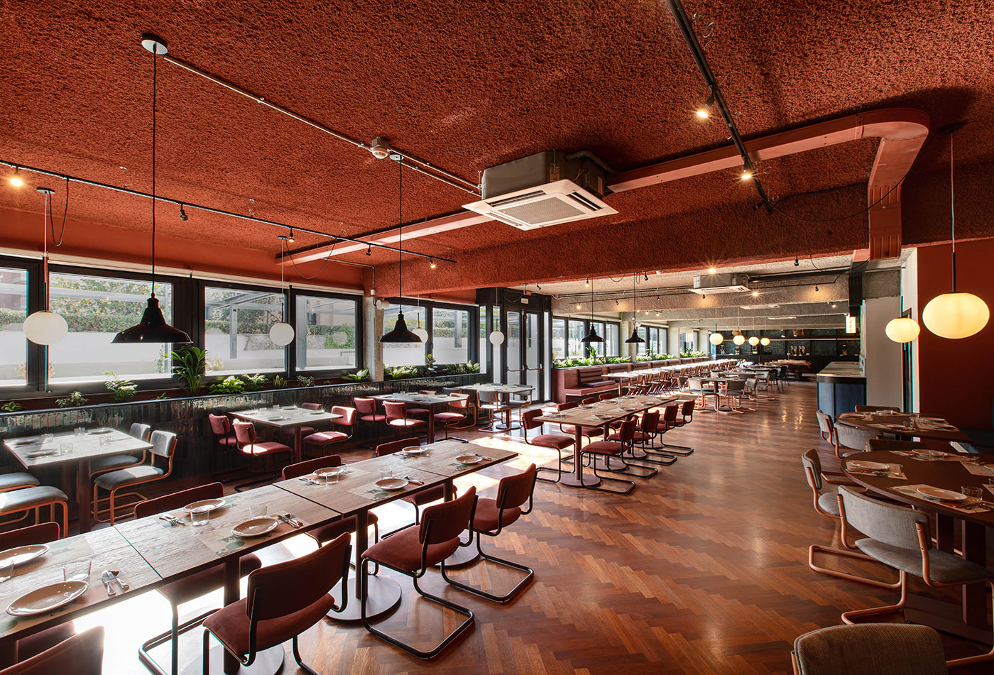 Parmi les projets de design d'intérieur, ce restaurant se distingue par sa moodboard chaleureuse qui rappelle plus que d'autres les tons des palais romains, tandis que la structure brutaliste en béton armé des poutres et des piliers contraste avec l'utilisation de matériaux naturels tels que le bois du sol et des tables monumentales.