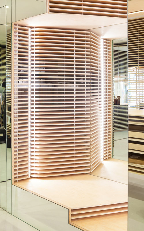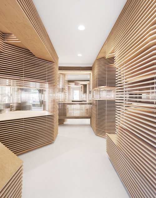 Dans la modélisation 3D du magasin, JMDS a exploité un processus de modélisation similaire à celui du cuir: grâce à des moules volumétriques, elle a découpé des espaces qui créent des vues à l'intérieur du magasin, entre les lamelles de bois. En supprimant les empreintes, on peut voir l'espace d'exposition qui a été créé