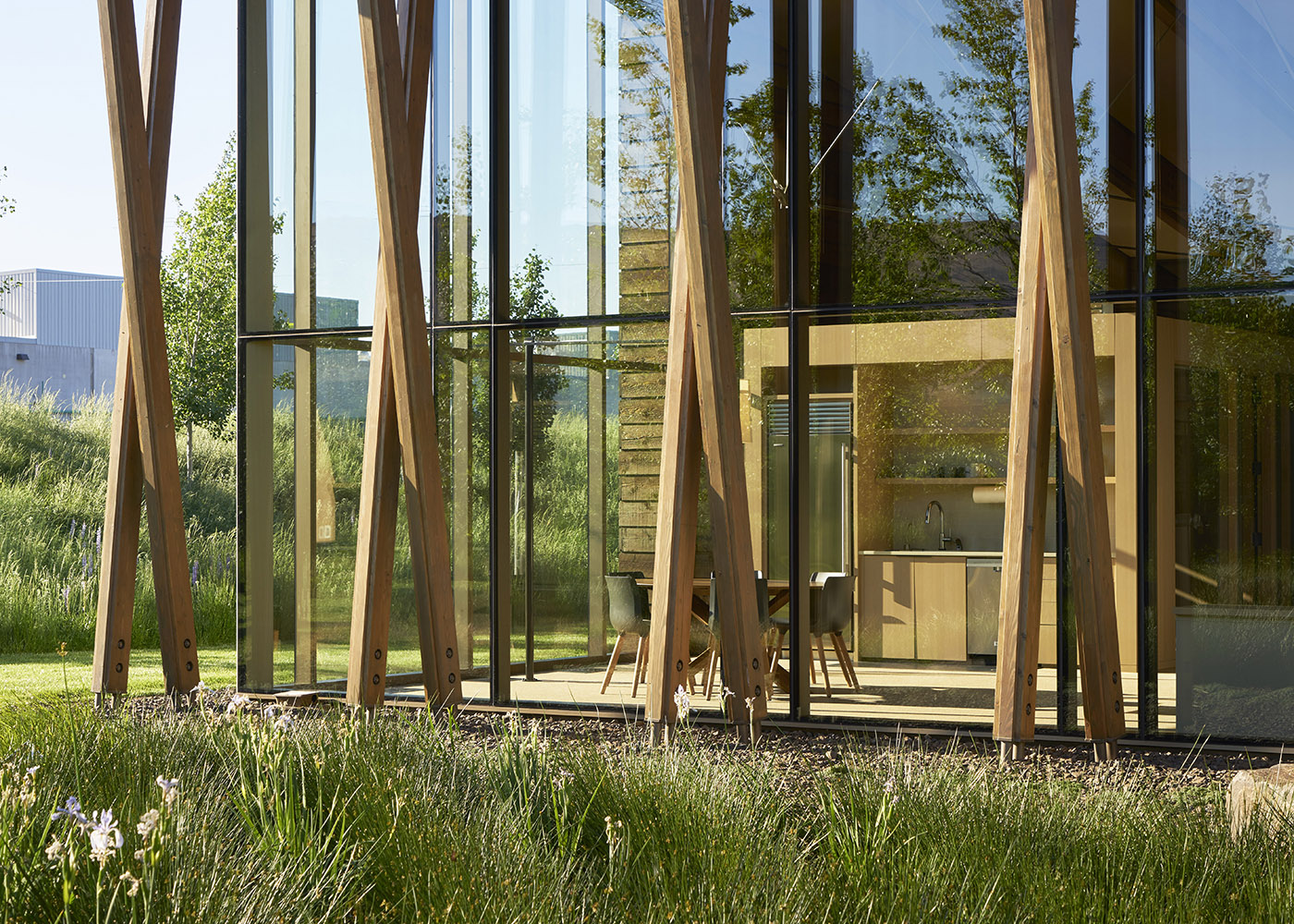 The interior is made of wood, a natural material. The interior decor ends well below the ceiling, ensuring a feeling of openness. The sales office is located in the short arm of the L, isolated from noise and enjoying more privacy. Everything is designed to create an environment conducive to concentration and work and surrounded by nature