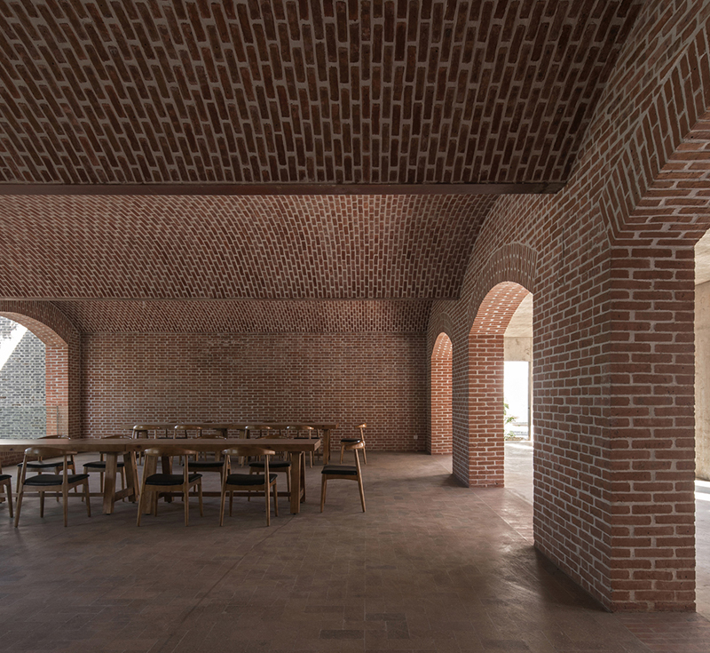 Les couloirs latéraux permettent aux visiteurs de se déplacer dans le lieu. Au dernier étage, il y a une structure en béton armé qui abrite des chambres d'hôtel avec vue sur la vallée. Les briques et le béton sont les matériaux clés de la structure: la robustesse de la construction en briques se marie avec la légèreté de la structure en béton