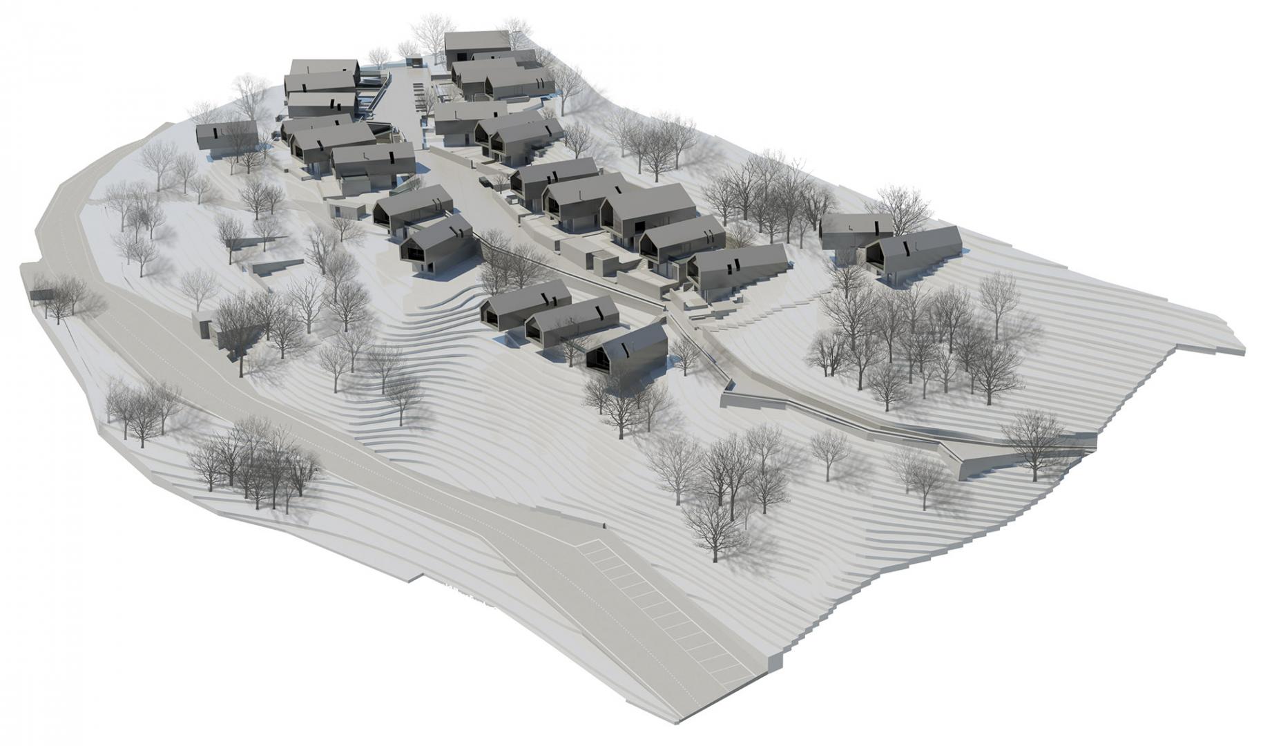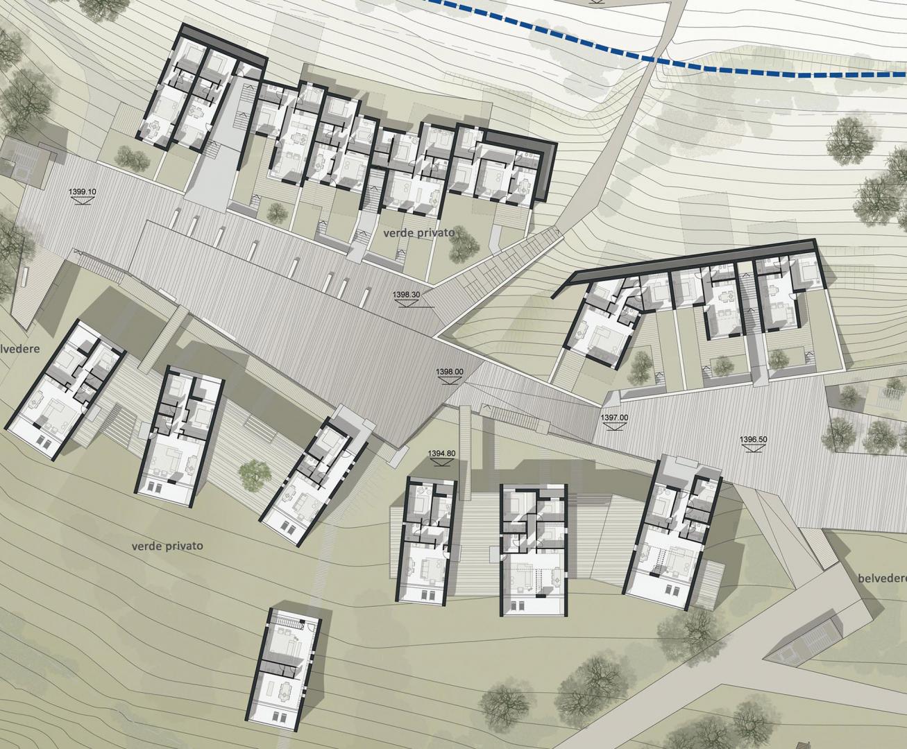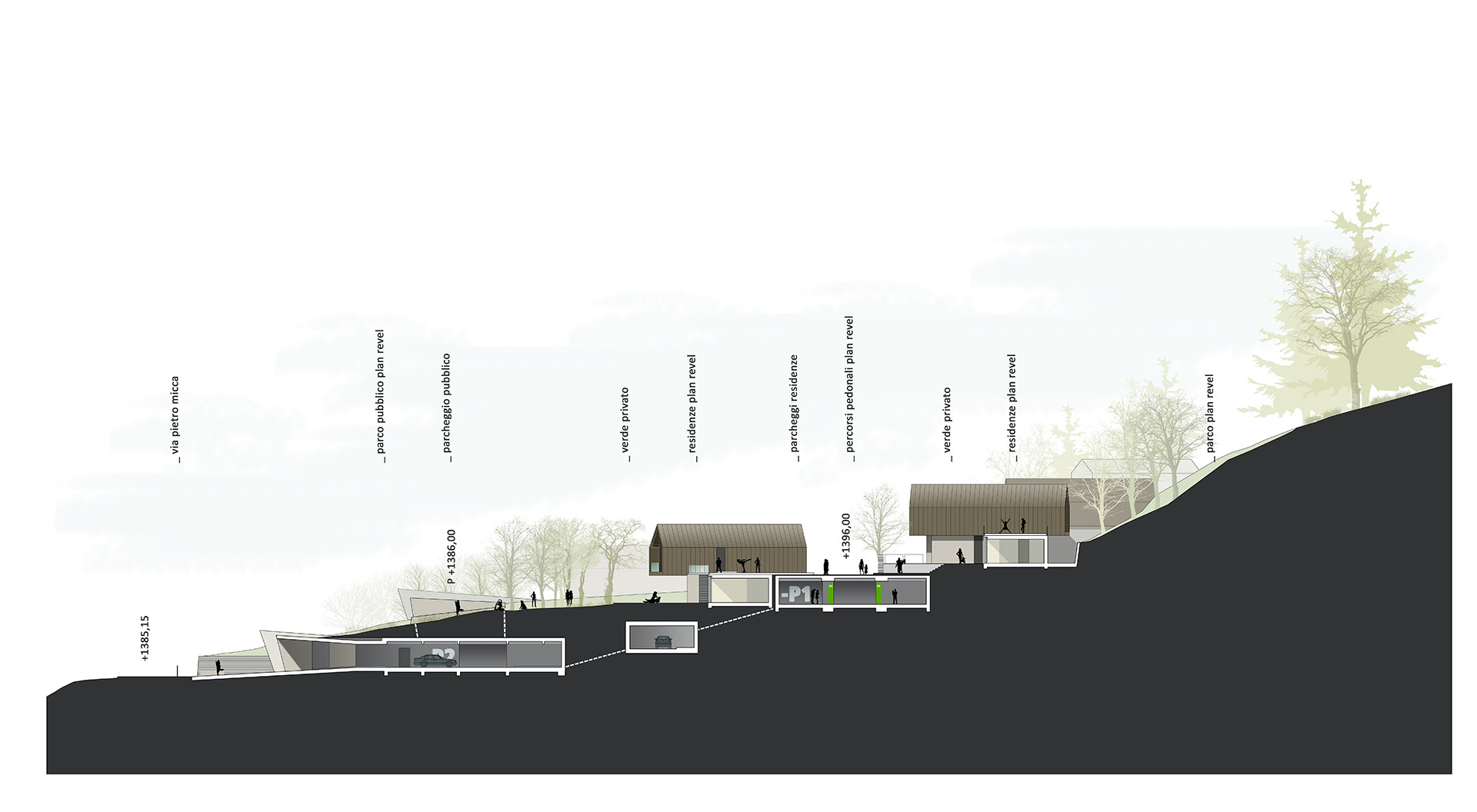 Il paesaggio viene posto quale elemento da valorizzare; si conservano i tracciati consolidati di accesso alla montagna, in una continua integrazione dell’intervento nell’ambiente montano. Gli spazi a servizio della residenza vengono visivamente minimizzati con strutture ipogee. I percorsi e gli spazi esterni sono studiati per creare luoghi di aggregazione sociale e di osservazione dello spettacolo naturale rappresentato dalle montagne circostanti