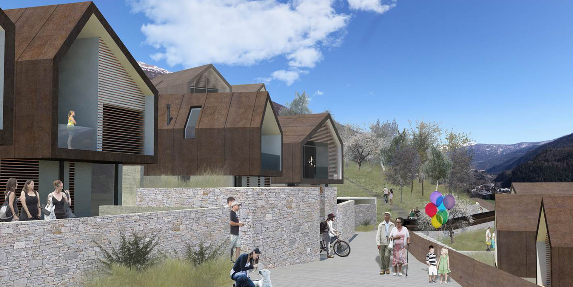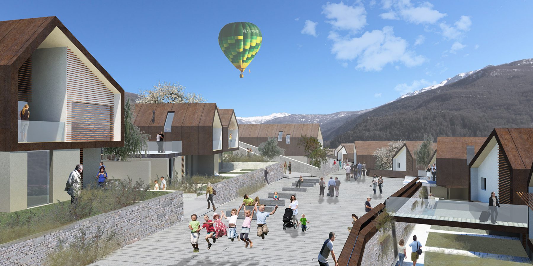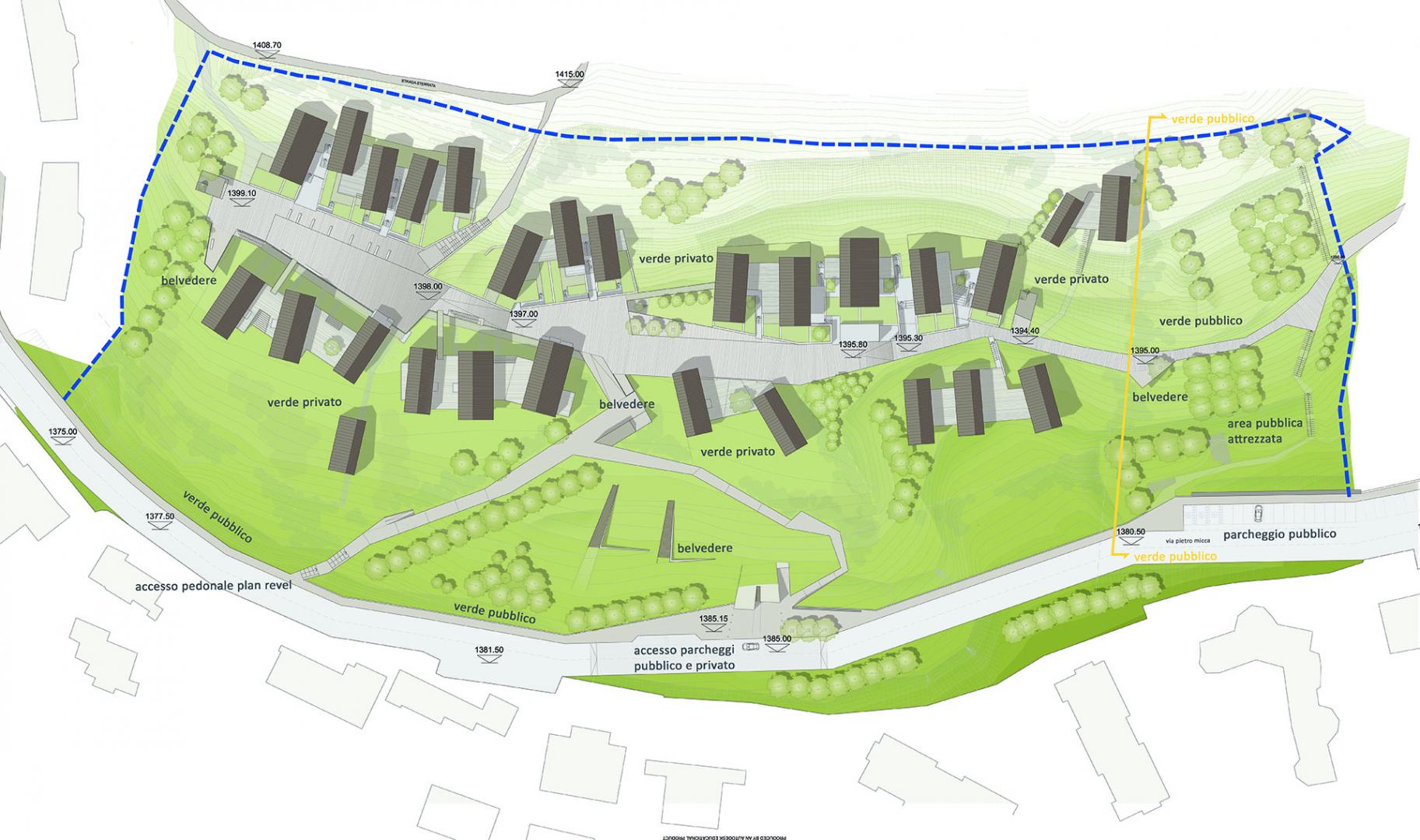 Il paesaggio viene posto quale elemento da valorizzare; si conservano i tracciati consolidati di accesso alla montagna, in una continua integrazione dell’intervento nell’ambiente montano. Gli spazi a servizio della residenza vengono visivamente minimizzati con strutture ipogee. I percorsi e gli spazi esterni sono studiati per creare luoghi di aggregazione sociale e di osservazione dello spettacolo naturale rappresentato dalle montagne circostanti