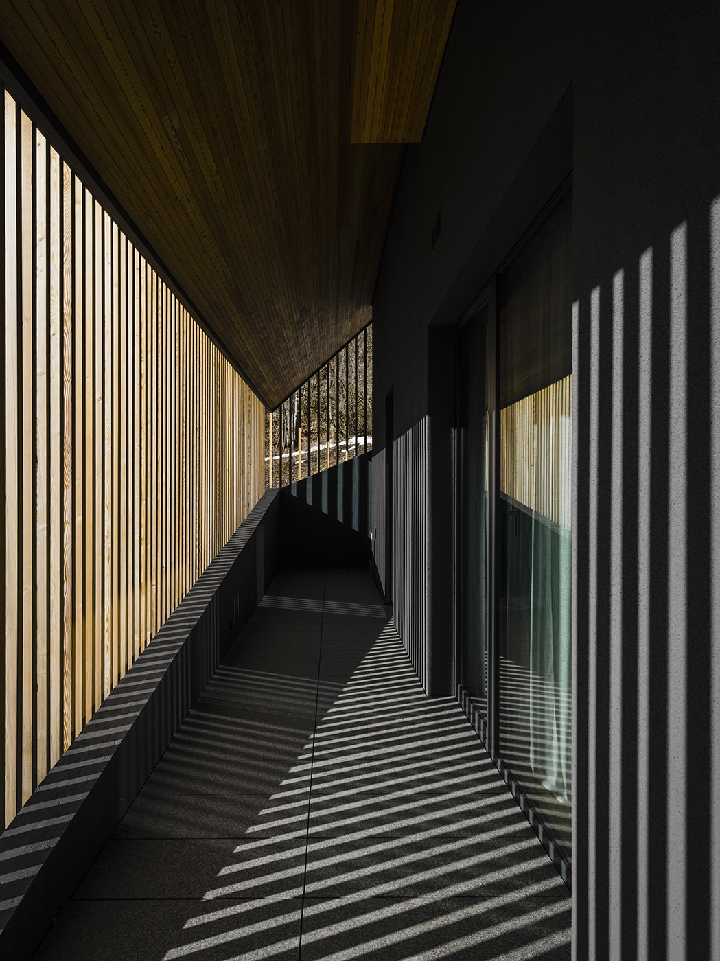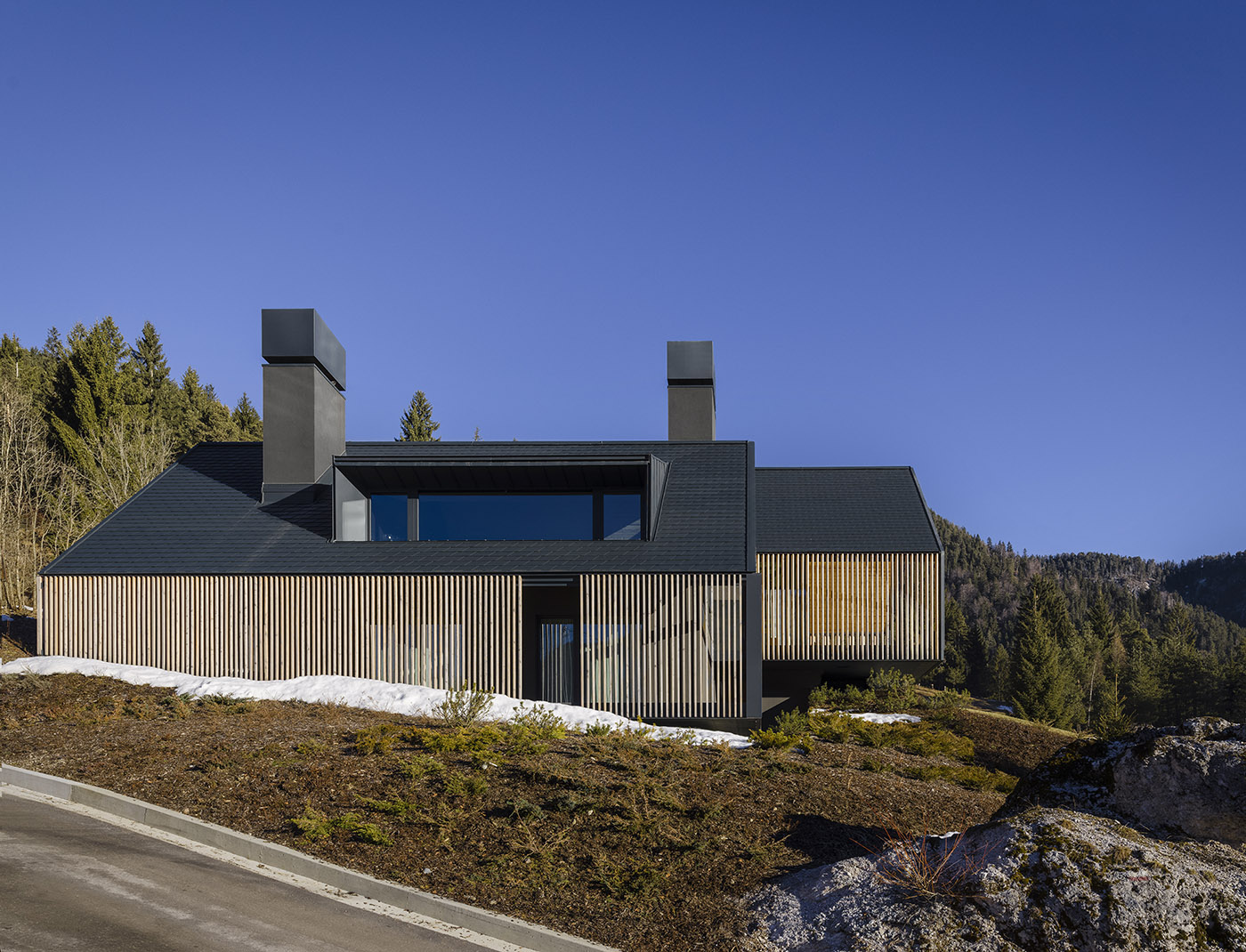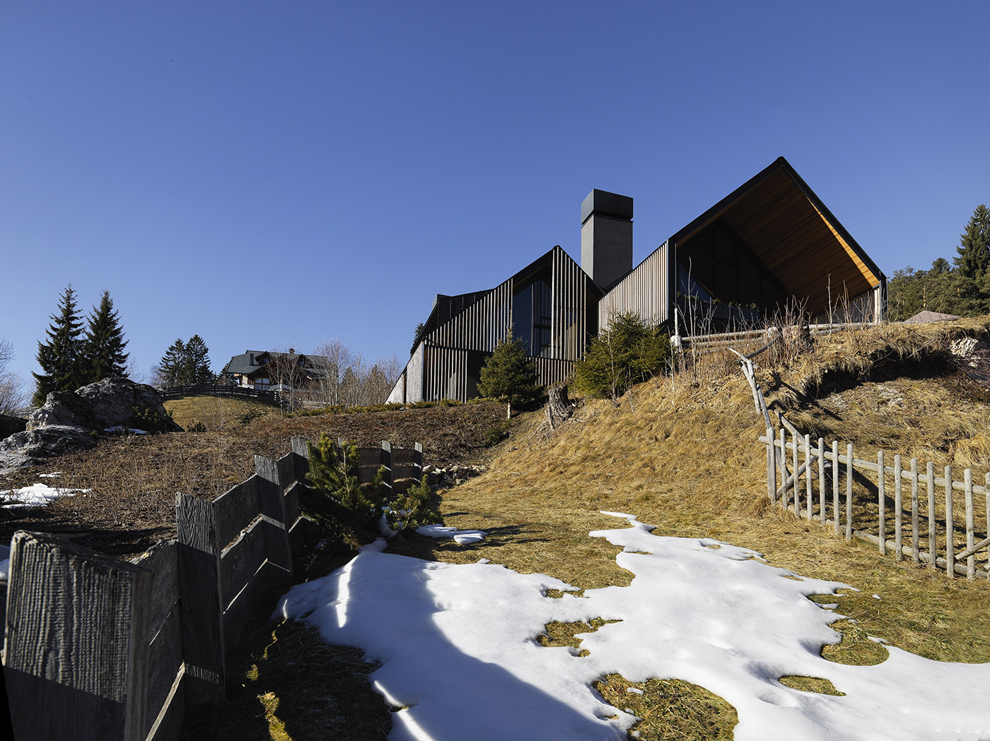Cette maison de vacances conçue par GEZA architettura est située dans un endroit caractérisé par des pentes du terrain et un panorama spectaculaire. L'accès à la maison se fait par une route en montée, où le bâtiment se montre et se cache parmi les autres, créant des effets scéniques uniques.