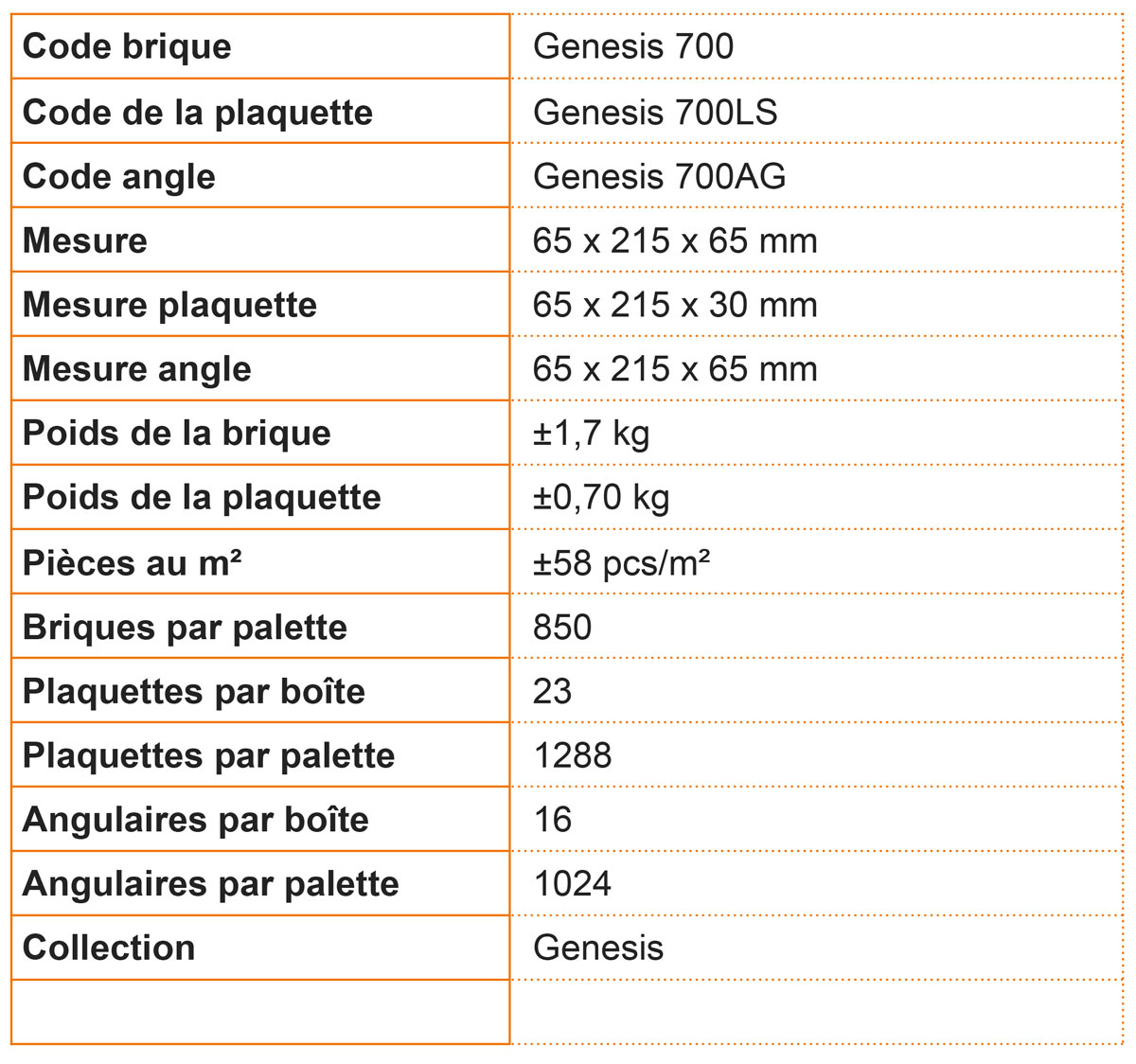 Réalisé avec des matières premières sélectionnées, Genesis 700 assure une résistance au gel, l'absence d'efflorescences et une excellente inertie thermique. Son processus de production avancé le rend adapté aux conditions climatiques difficiles et aux contextes caractérisés par de fortes variations thermiques, garantissant fiabilité et durabilité.