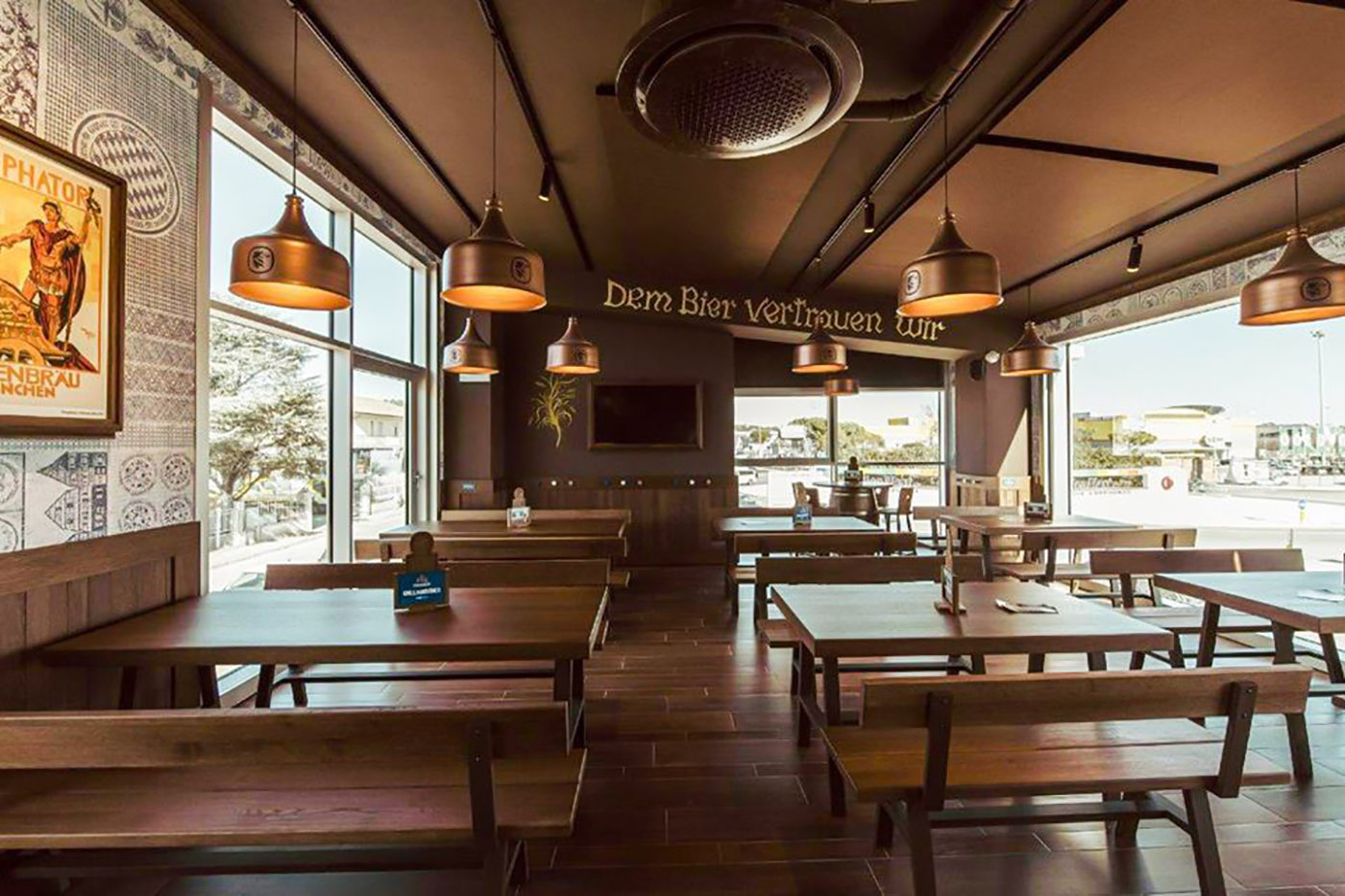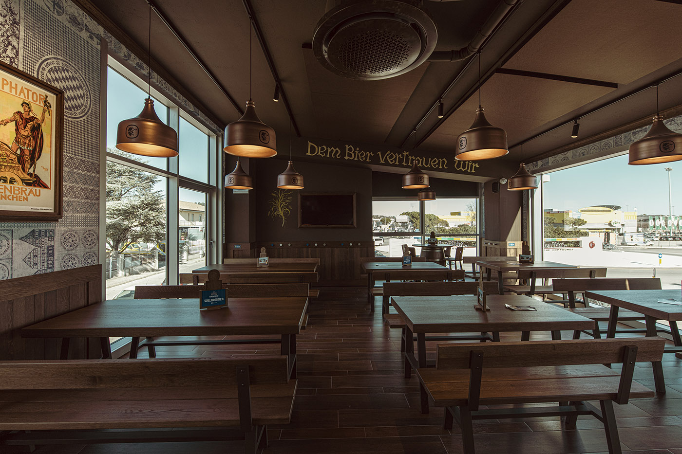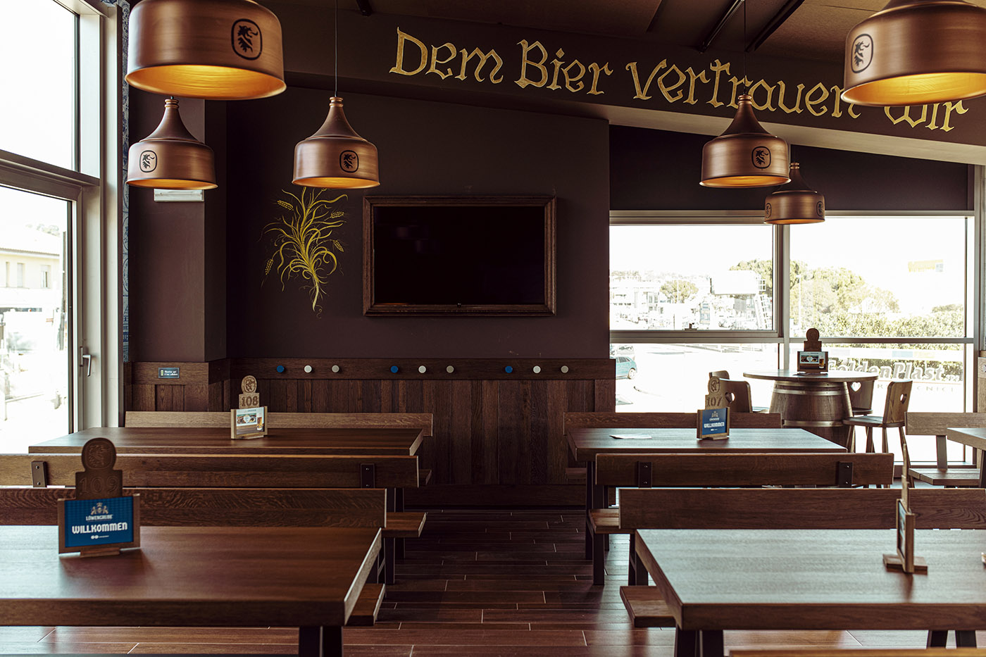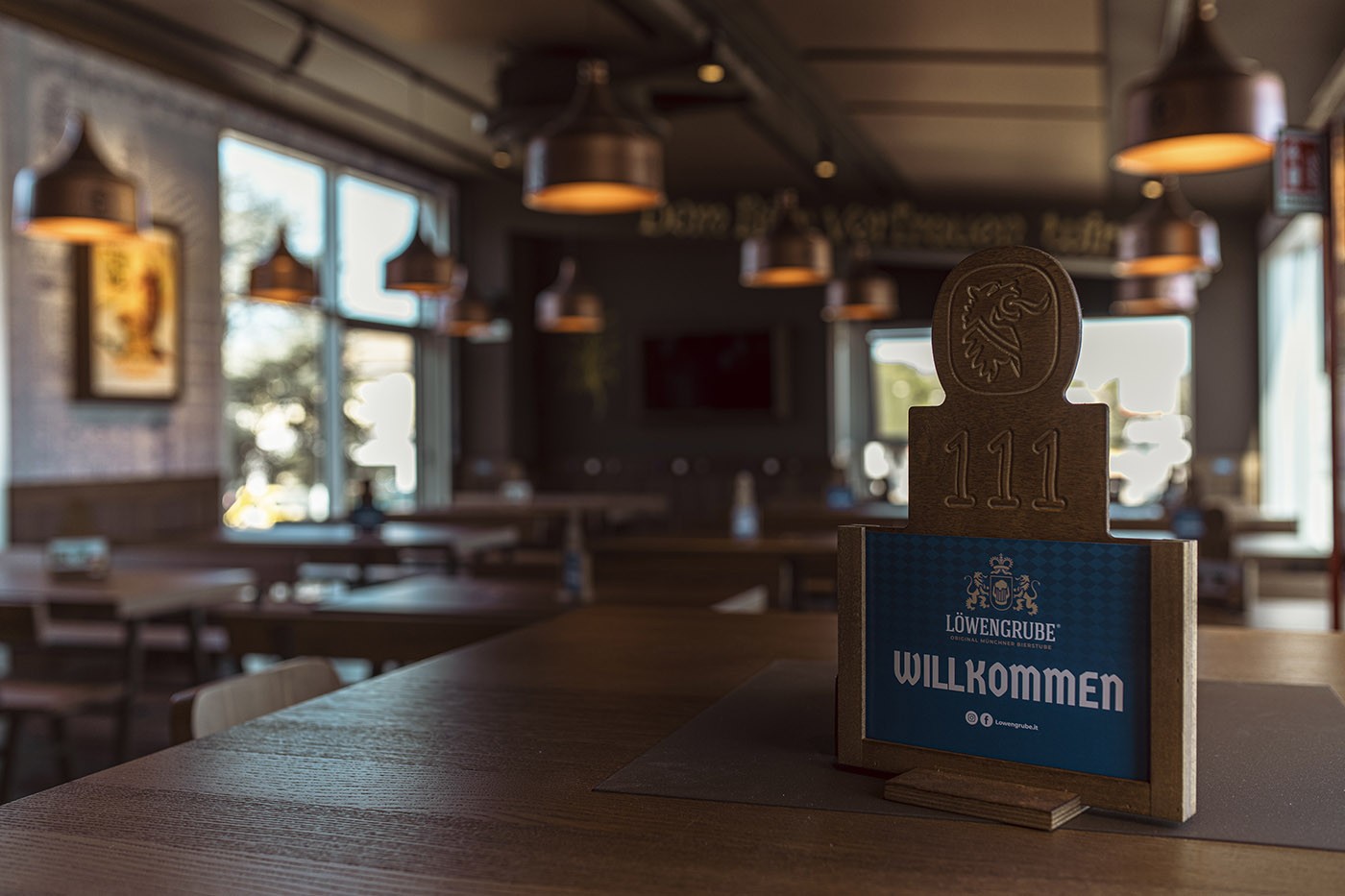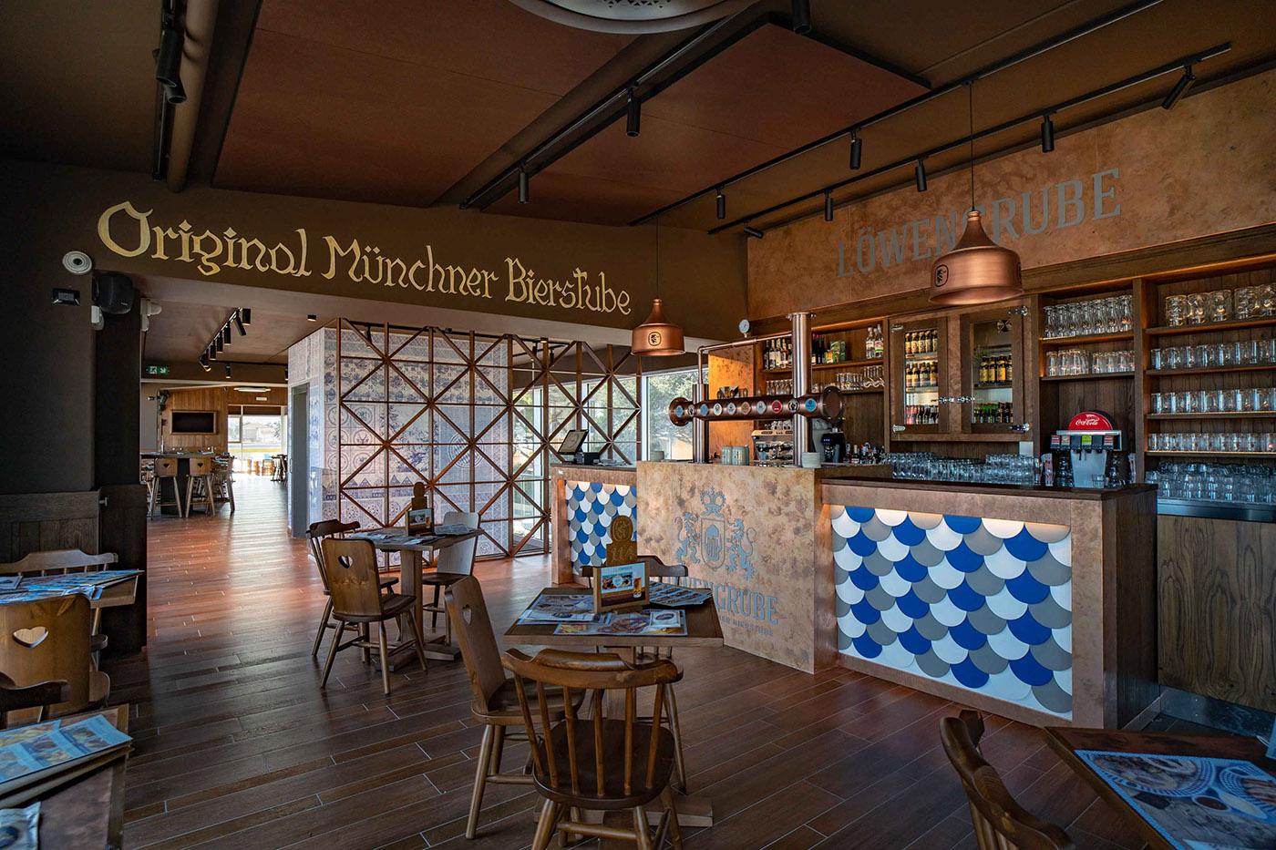 I pannelli a soffitto «replicano la tonalità di marrone dei rivestimenti delle sale, grazie a una personalizzazione che ha previsto una minuziosa campionatura del colore. Un processo in più fasi che grazie alla disponibilità dell’azienda ha fatto sì che tutti gli elementi fossero abbinati cromaticamente tra loro» sottolineano gli architetti Francesco Scanu e Bruno Grasso. Sui pannelli a parete, incorniciati come veri e propri quadri, sono stati invece stampati soggetti e dettagli ispirati alla tradizionale iconografia bavarese che caratterizza la brand identity del marchio Lowengruebe.