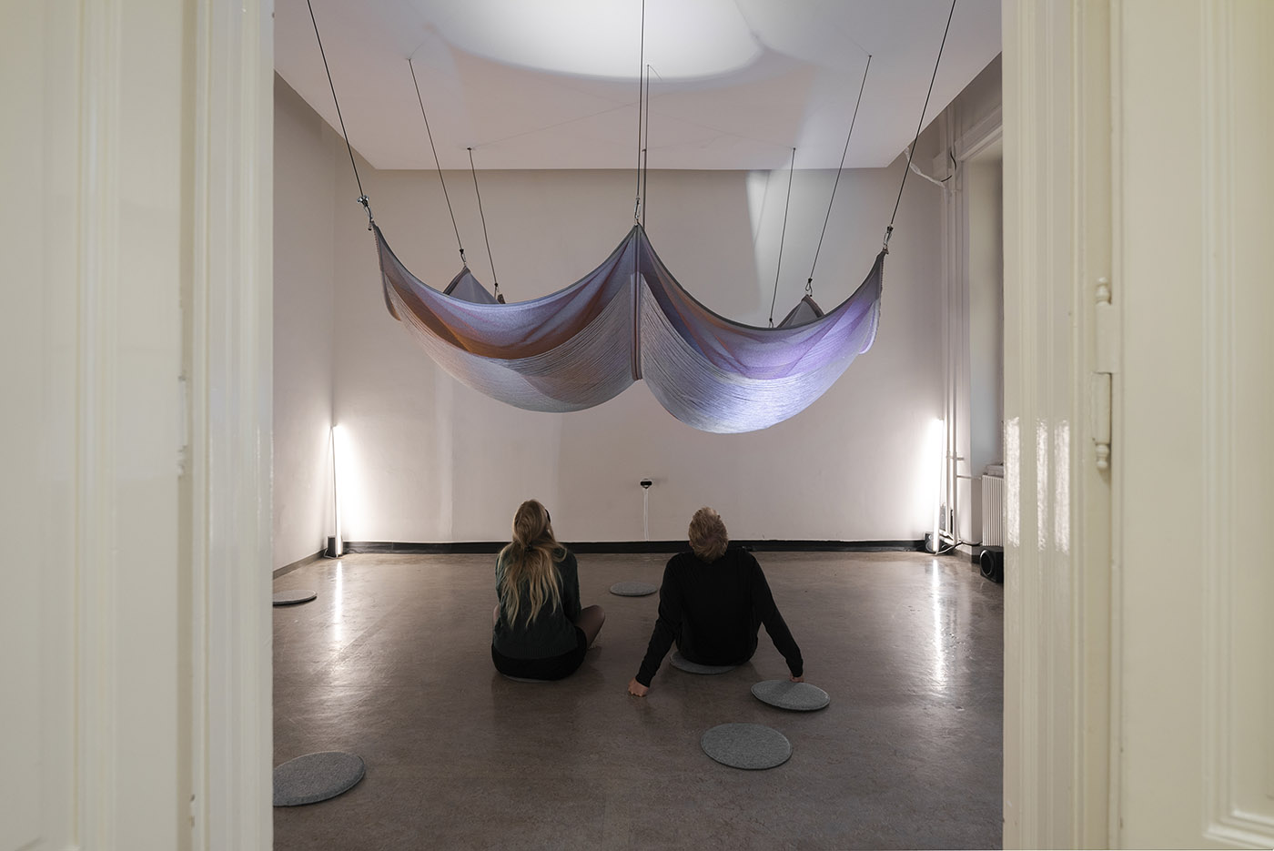 Il collettivo svizzero-tedesco costituito da Marie Schumann, Lisa Marleen Mantel e Matthias Rosenthal, crea un’istallazione interattiva con tessuti lievi e fluttuanti che si intrecciano tra loro e si muovono al tocco e al passaggio dei visitatori. Gli artisti inducono un modo inusuale di scoprire uno spazio attraverso la scoperta della multi-dimensionalità, il movimento e il gioco