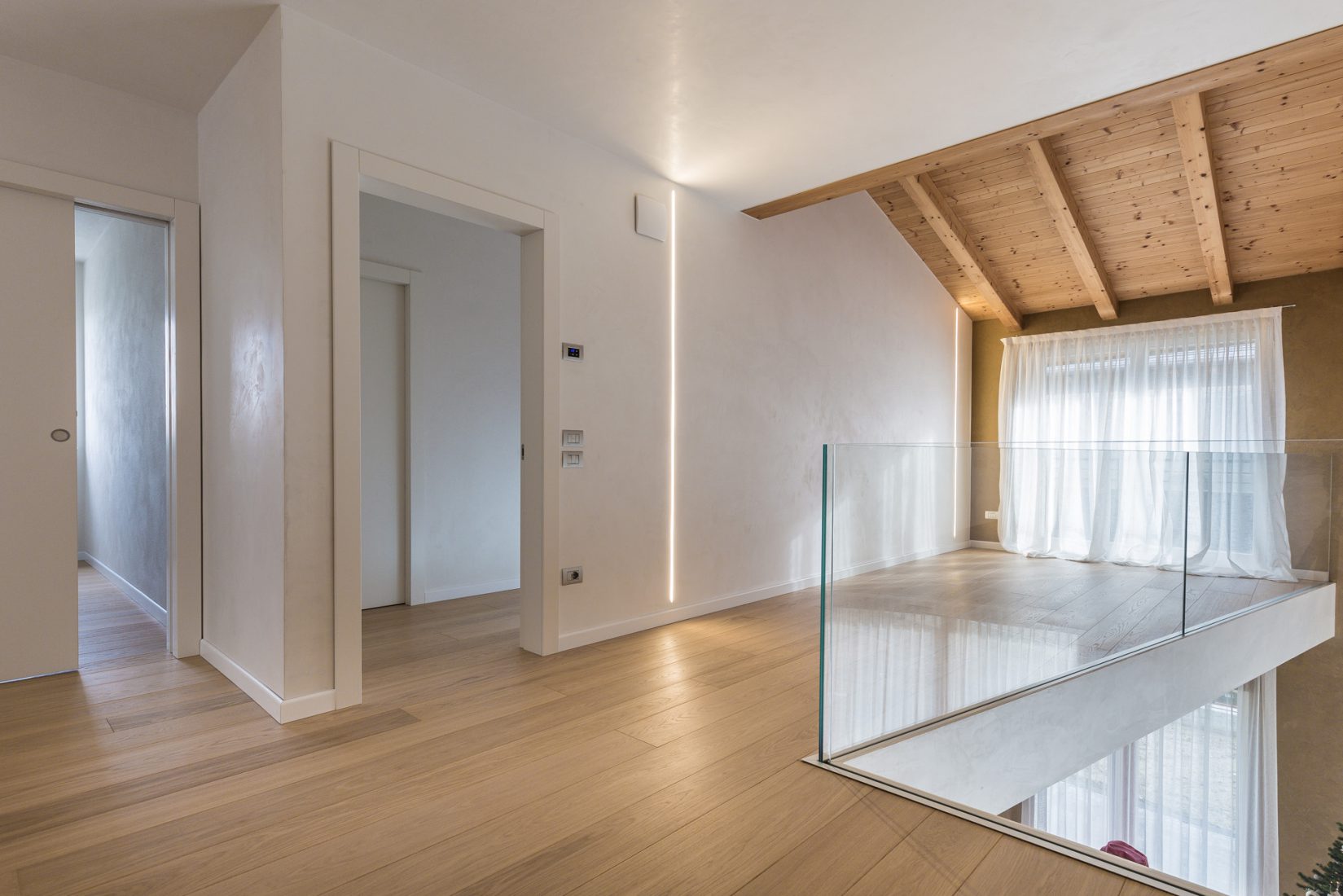 Al piano terra trovano spazio lo studio, bagno, deposito e il parcheggio coperto. Al piano superiore sono previste due camere da letto, una camera da letto matrimoniale, bagno, terrazza e balcone
