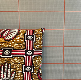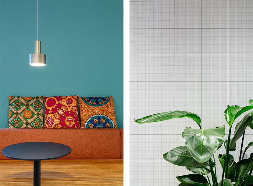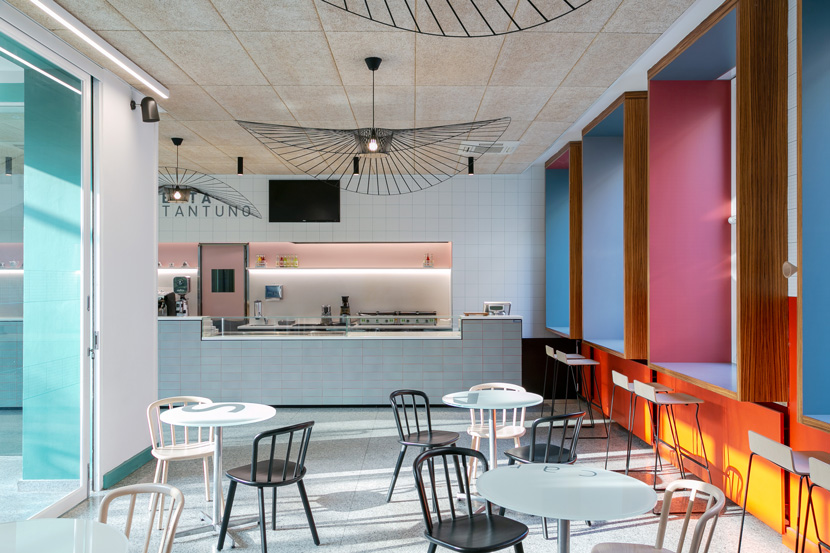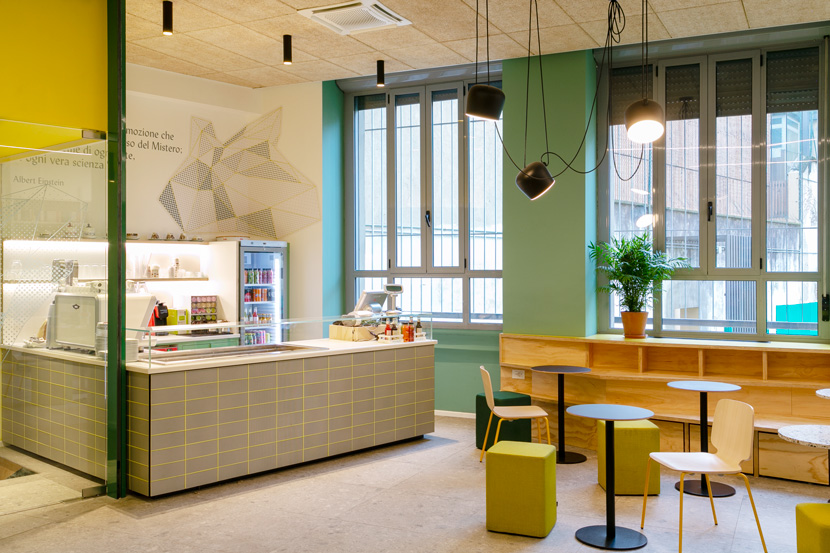 Lo spazio è caratterizzato da una palette di colori giocata sui toni del verde e del rosa antico. Una tappezzeria a quadretti che ricorda la trama dei quaderni di scuola, il bancone piastrellato con le fughe colorate, le grandi lampade nere e leggere danno un mood “grafico” e di carattere allo spazio. Molta attenzione è stata posta ai dettagli e alla ricerca dei materiali: graniglia per i tavolini, ottone per le lampade a sospensione e tessuti africani per i cuscini prodotti da donne di una cooperativa senegalese.