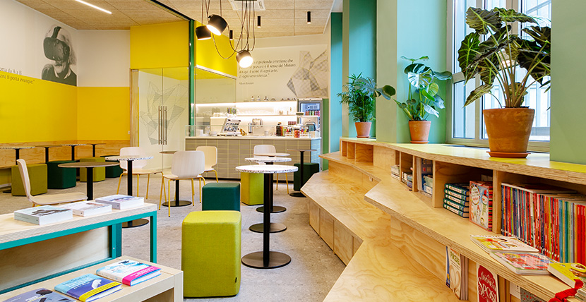 Il secondo spazio, lo Zenale Otto, è invece uno spazio più piccolo e flessibile che incorpora al suo interno caffetteria, libreria e location per piccoli eventi. Come un paesaggio fluido, cambia configurazione grazie ad arredi flessibili che, non solo si possono spostare facilmente ma cambiano anche funzione all’occorrenza.