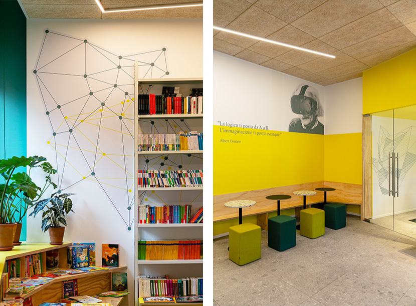 Il display dei libri infatti diventa un piccolo palco per gli ospiti dei talk, mentre la libreria bassa dall'andamento spezzato diventa una tribuna per il pubblico. Un'alternanza di colori vivaci sui muri, dal verde al giallo fluo con il legno naturale e la graniglia. A decorare le pareti, citazioni e immagini di grandi uomini in formato large.
