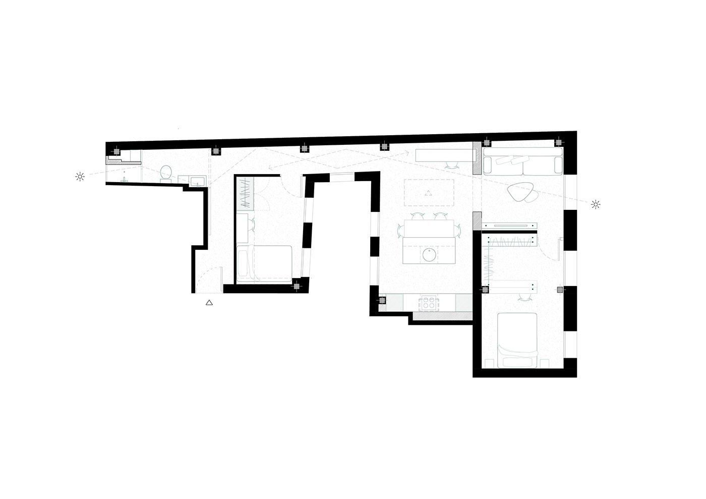 L’altro tema della ristrutturazione riguarda la luce: l’appartamento si trova ad un primo piano distribuito attorno ad un piccolo cortile. Il passaggio della luce negli ambienti della casa era ostacolato da una distribuzione frammentata e poco fluida