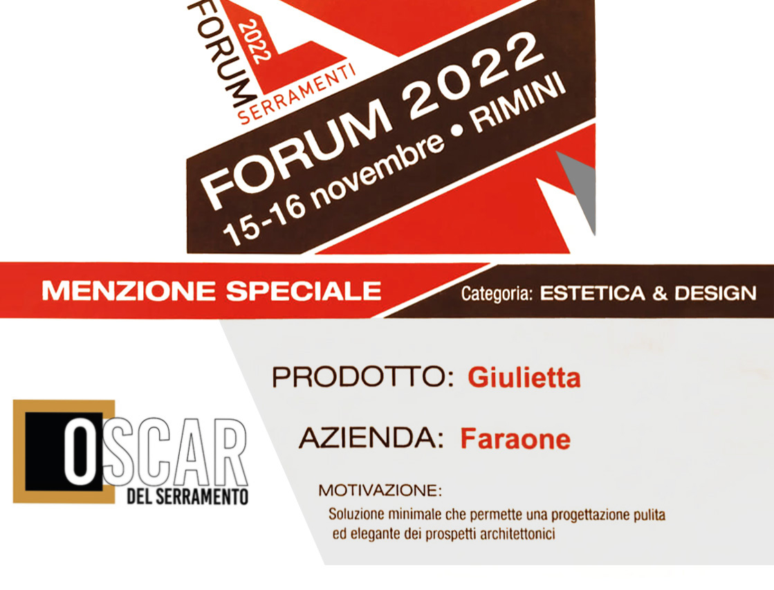 L’Oscar del Serramento ci conferma che tutto il lavoro che ci ha consentito di arrivare a creare Giulietta è stato compreso e apprezzato dagli esperti del nostro settore. E che anche le potenzialitàestetiche di questo progetto Faraone sono state colte appieno”.