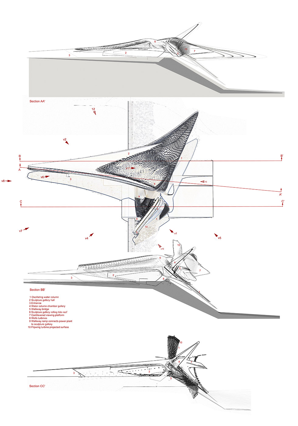 L'angolo della galleria di sculture della linea costiera corrisponde all'angolo del rigonfiamento, che a sua volta crea onde di rottura del punto che non perdono la loro forza mentre viaggiano. L'architettura influenza le onde. Quando l'energia delle onde converge contro l'elemento sporgente dell'edificio attiva la sezione di colonna d'acqua oscillante
