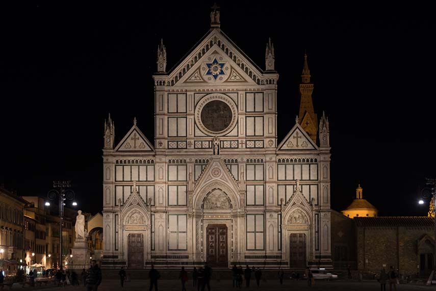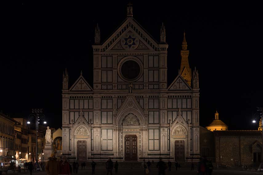 Il progetto di lighting design per la facciata della celebre Basilica Santa Croce è realizzato dallo studio MICROSCAPE architecture urban design AA in occasione del Festival F-Light 2016 ed è stato molto apprezzato dalla Soprintendenza dei Beni Artistici di Firenze, tanto da essere mantenuto come illuminazione permanente. La dinamizzazione teatrale dell’architettura è creata dalla variazione di intensità e temperatura di colore della luce bianca emessa da 22 proiettori MaxiWoody Compact Tunable White a LED e controllata dal sistema DMX
