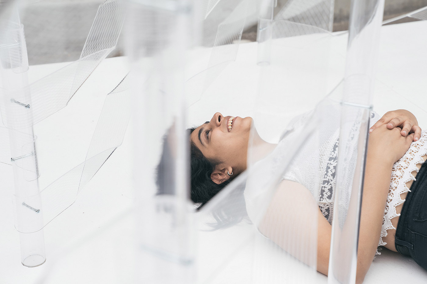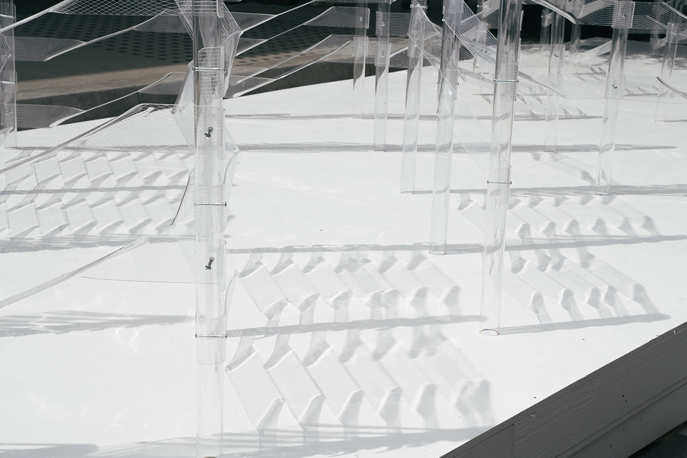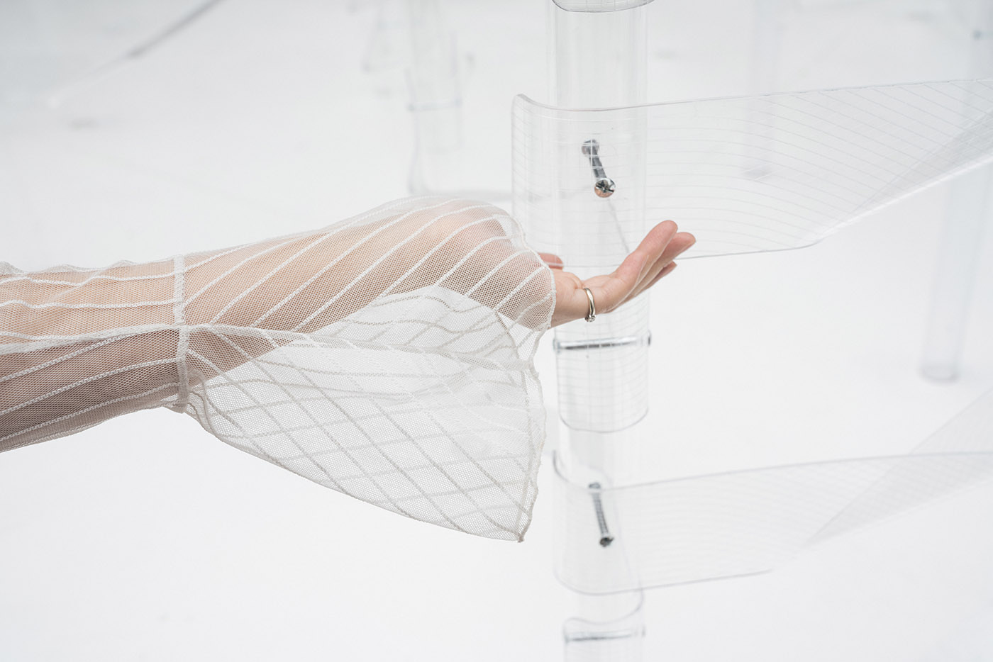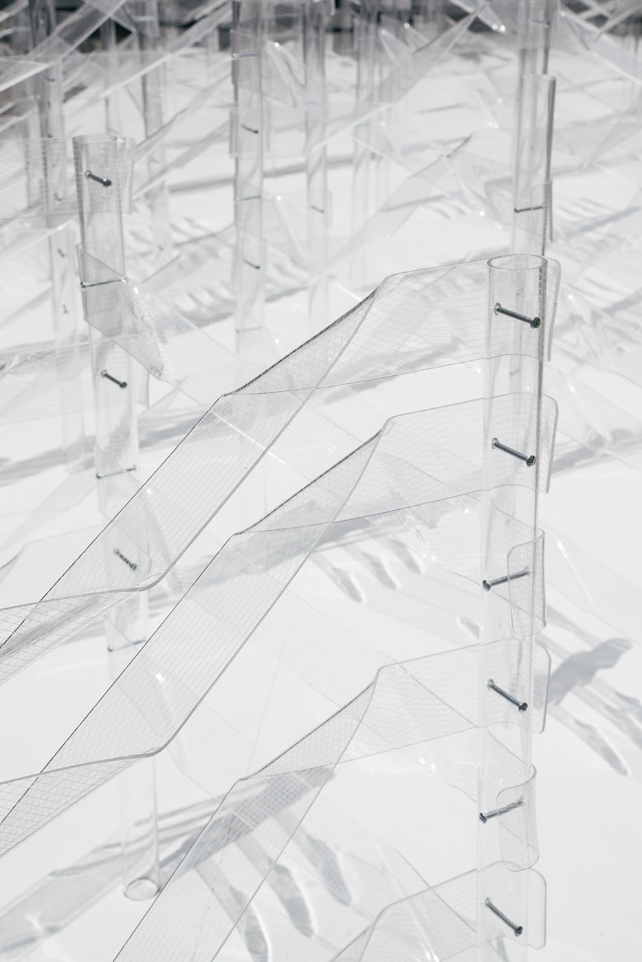 Kori mira a testare ed esplorare le proprietà uniche dell'acrilico coinvolgendo il materiale attraverso un approccio bottom-up. Sperimenta il concetto di trasparenza, giocando con la percezione di profondità a cui siamo abituati, per creare uno spazio giocoso ma etereo ispirandosi alla materialità del ghiaccio