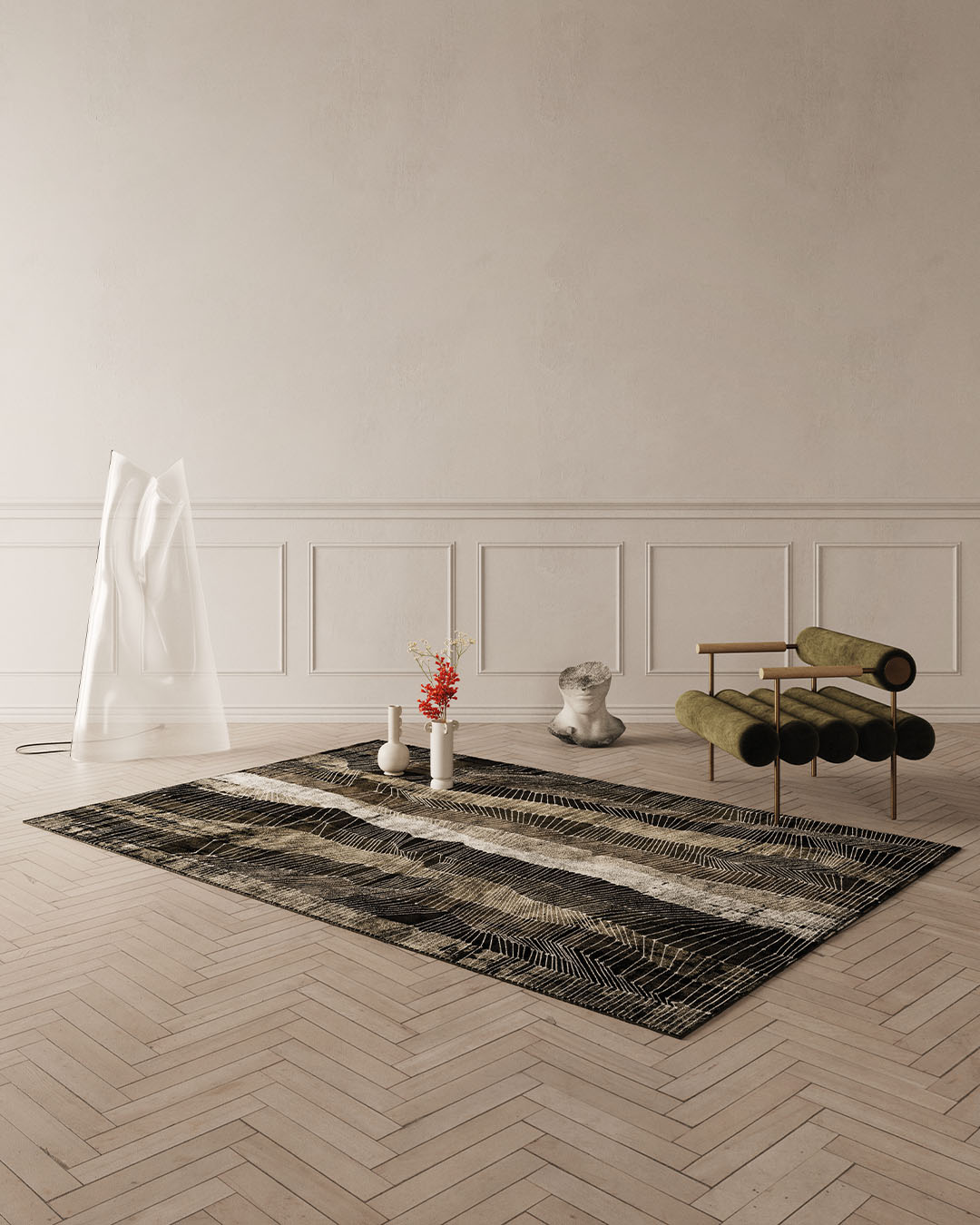I principali mondi materici sui cui Inkiostro Bianco si sperimenta sono: carte da parati, legno e tappeti INK.RUGS.
