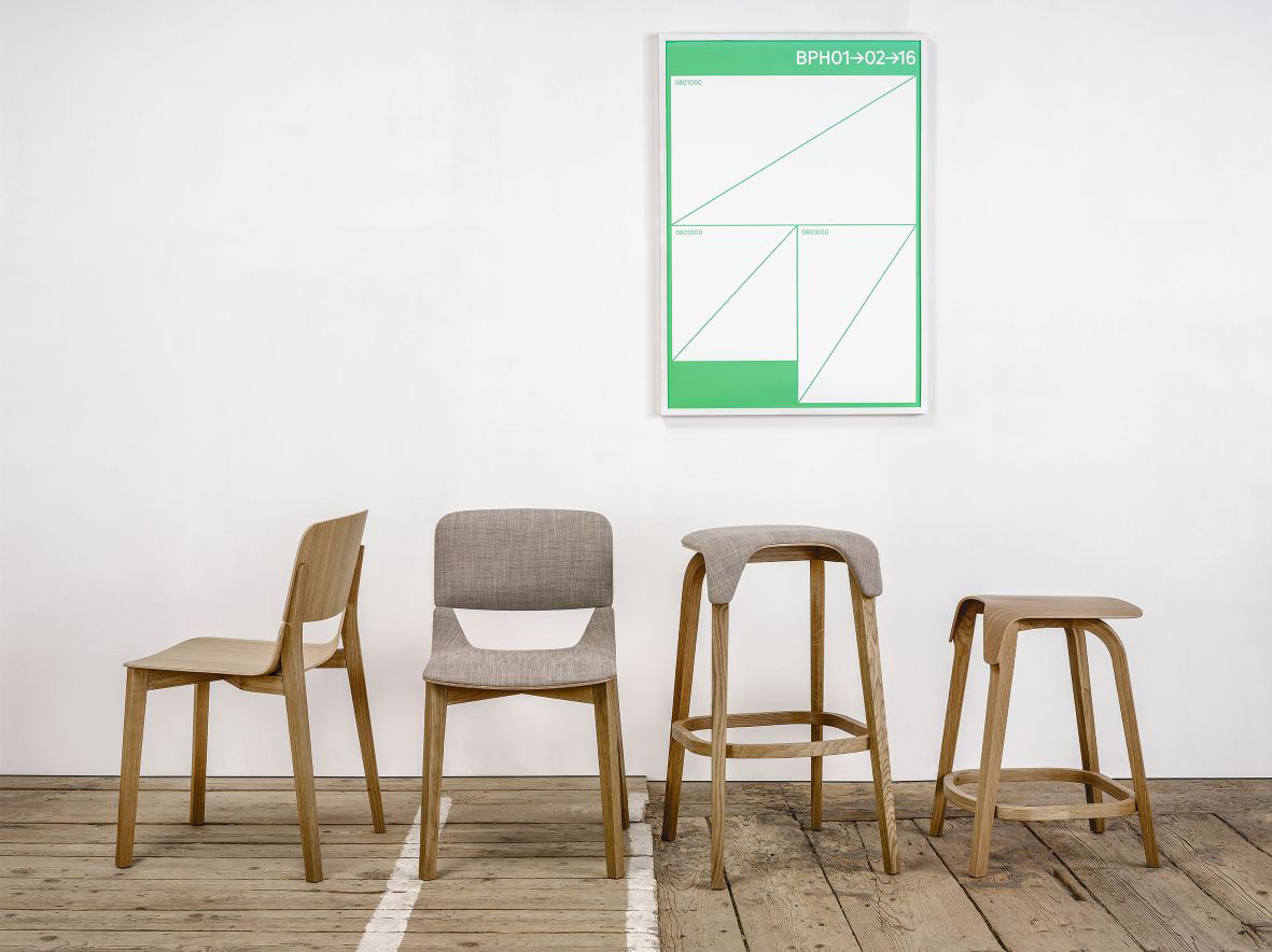 Le sedie e gli sgabelli sono stati realizzati in due varianti di altezza differente. Sono composti da una struttura portante in legno massello, completata da sedili e schienali di compensato sagomato visivamente leggero