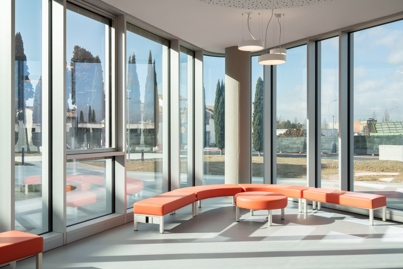 In ragione dei manufatti con cui l’edificio si trova a confrontarsi, sono stati scelti caratteri differenti per i suoi fronti: ad ovest un sistema di facciata continua con una percentuale di vetrazioni superiori alle porzioni opache, in segno di apertura ed accoglienza verso l’utente e la comunità; una configurazione che si pone anche in relazione con la pista ciclabile, alla viabilità pedonale e veicolare, nonché all’area a verde vicina.