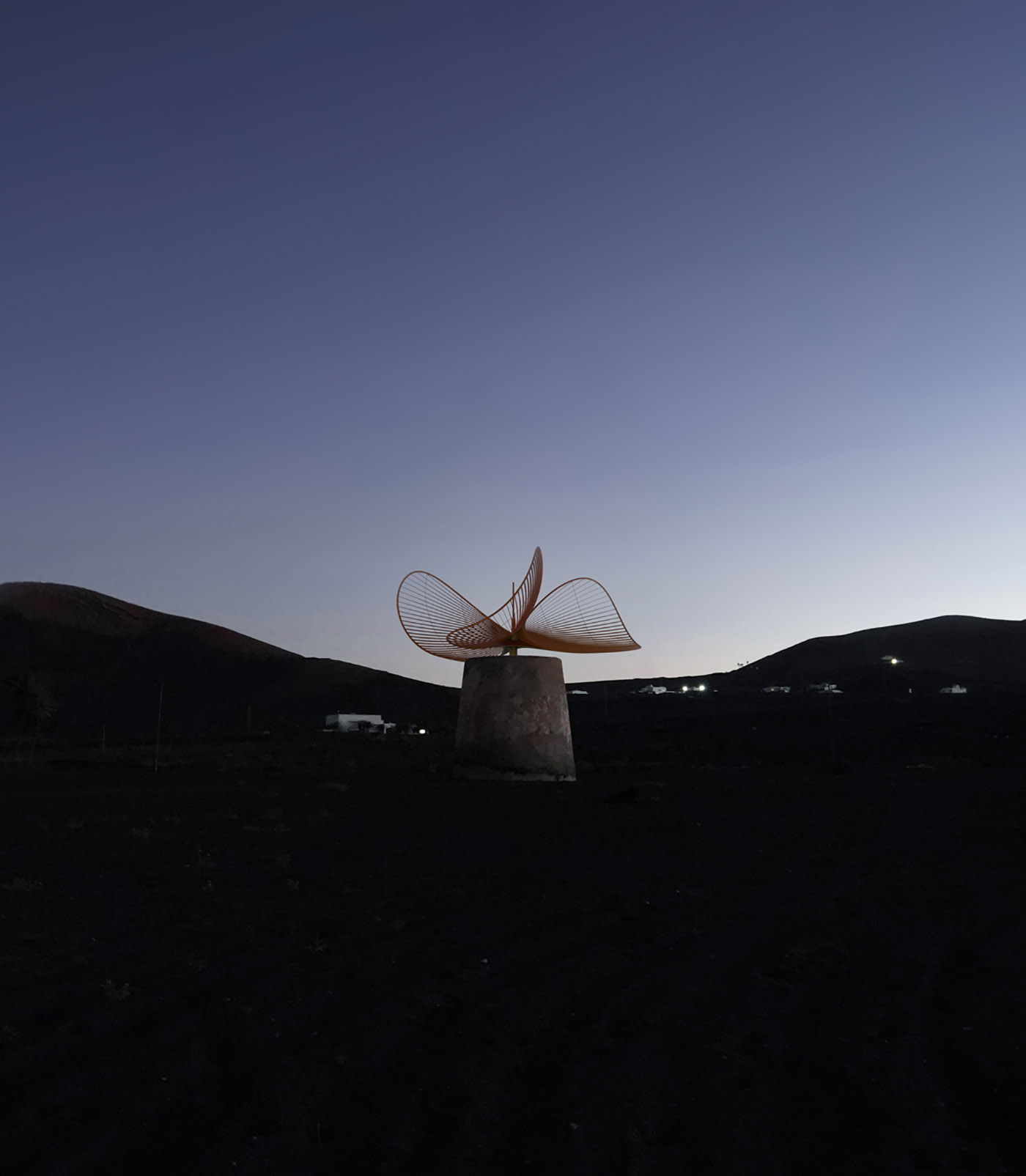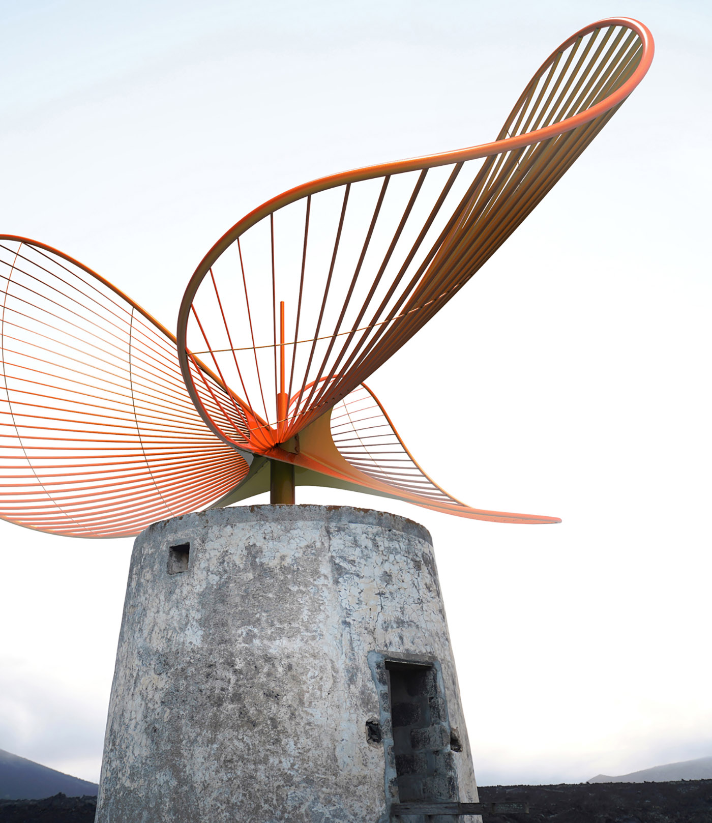 Ispirato dall’isola dei vulcani, l’artista Vincent Leroy disegna un'elegante e morbida membrana come elica da innestare sul materico basamento di un antico mulino, creando un nuovo tipo di turbina eolica
