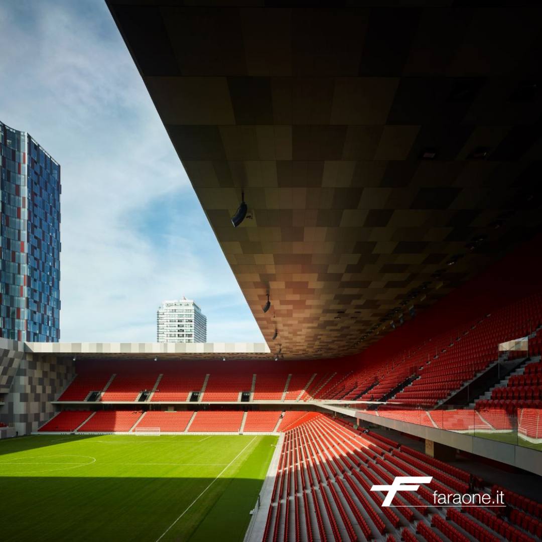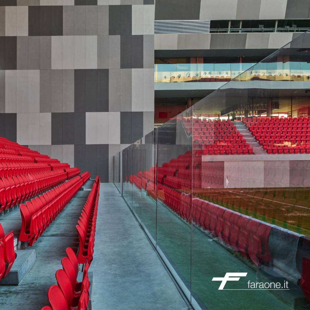 Grazie al tamponamento in vetro, l’edificio esprime l’idea di leggerezza che si contrappone alla struttura storica in travertino. Il vetro ritorna all’interno dell’edificio con i parapetti Ninfa Stadio progettati e forniti da Faraone; massima sicurezza, trasparenza (no barriere visive) e design moderno rendono i parapetti Faraone la soluzione ideale per gli impianti sportivi di tutto il mondo.