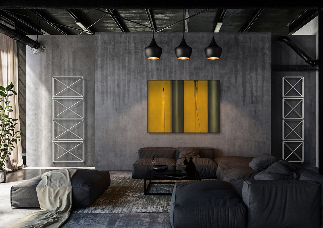 Un radiatore si prende la scena e diventa punto focale dell'arredamento. Una forma senza forma, tridimensionale eppure vuota, un traliccio che ricorda volutamente elementi da costruzione, ponteggi o scaffalature.