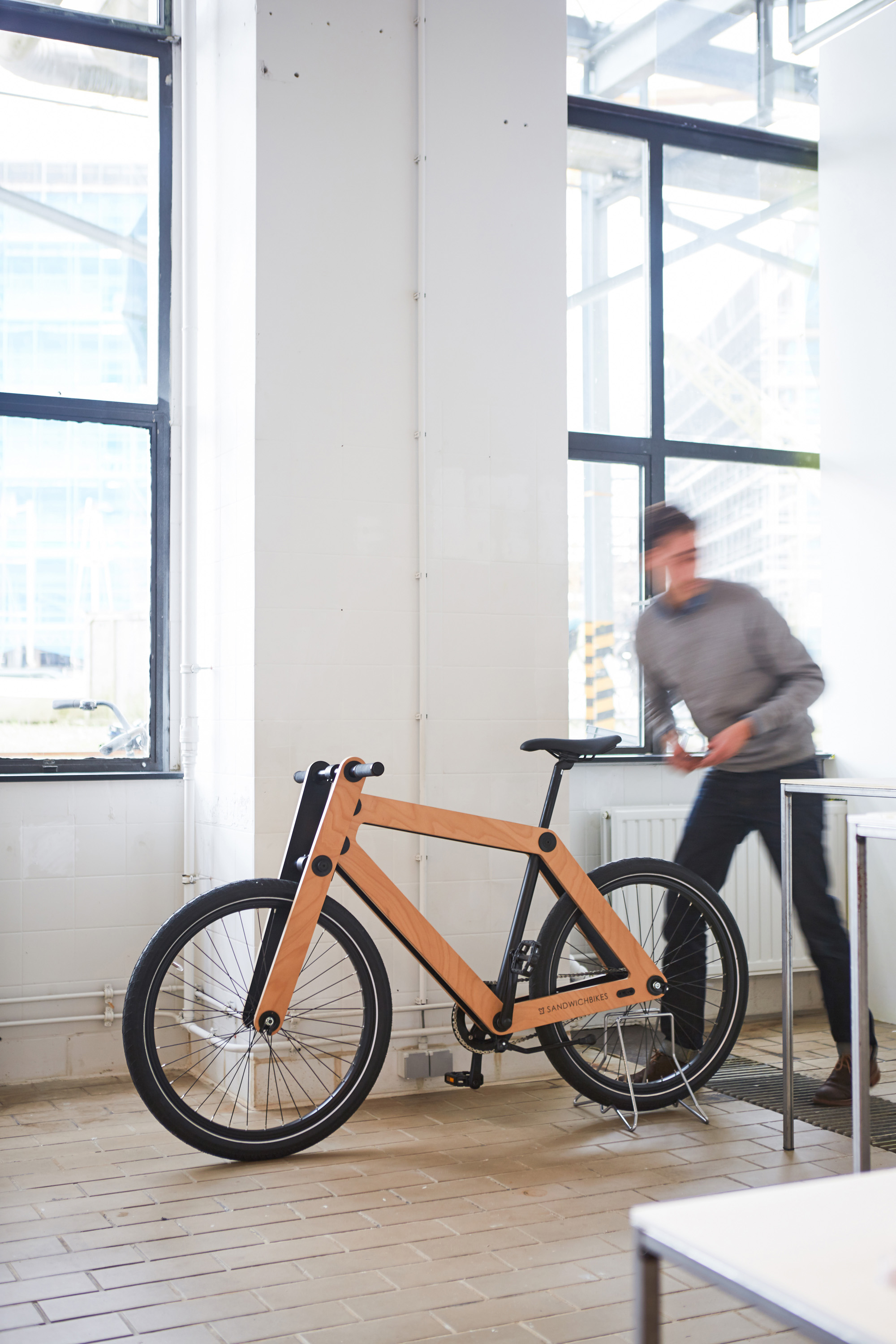 Per permettere di costruirlo da solo, si è dovuto ripensare ogni aspetto del velocipede classico. Invece di un telaio saldato, The Sandwichbike è una bicicletta progettata come un "sandwich" con due telai rivestiti di compensato stratificato. Legati insieme da "cilindri intelligenti". Questi componenti, una volta montati, diventano una bici duratura ed estremamente attraente