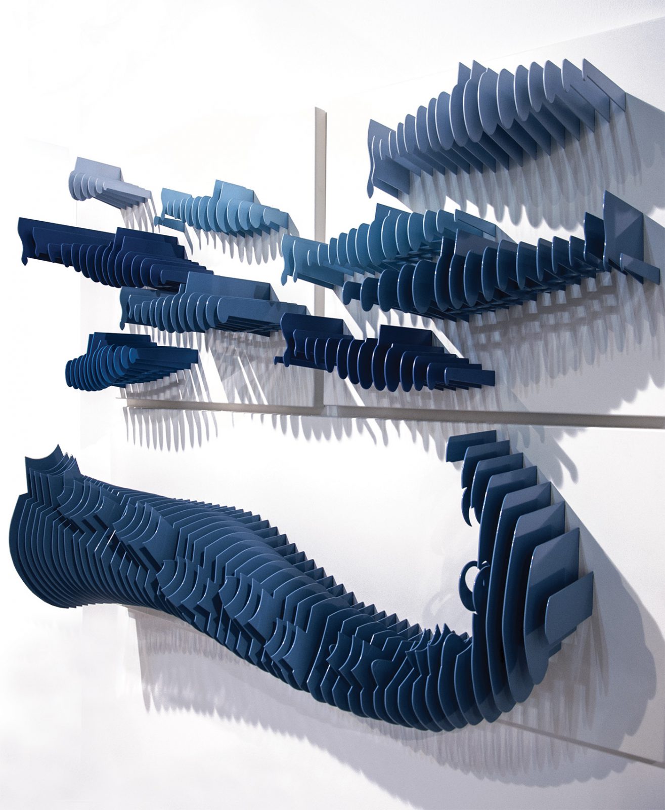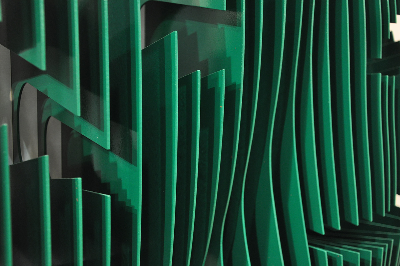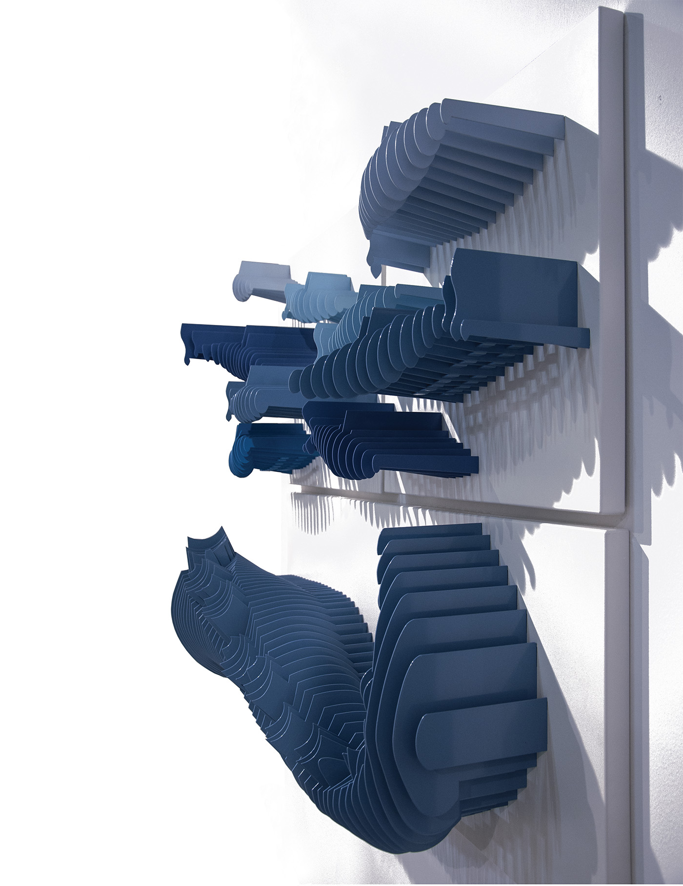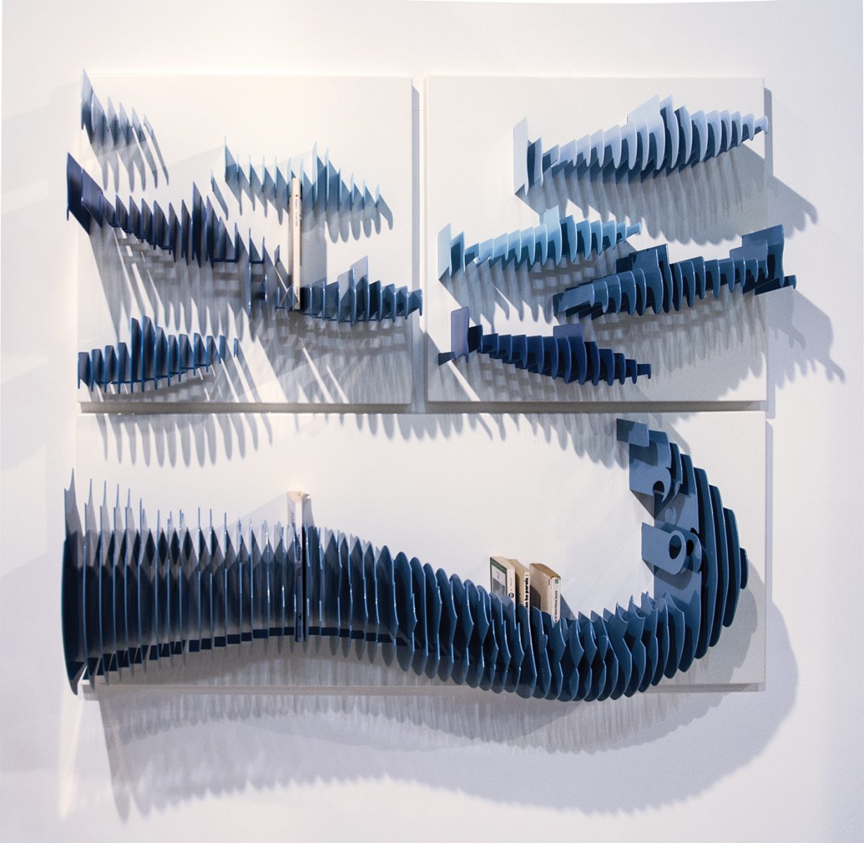 Vengono tagliate a laser una serie di sezioni, fissate al piano di fondo, faranno da appoggio ai libri e che comporranno un elemento tridimensionale che “viene fuori dal muro”, arricchendo la parete di un gioco di colori e di profondità