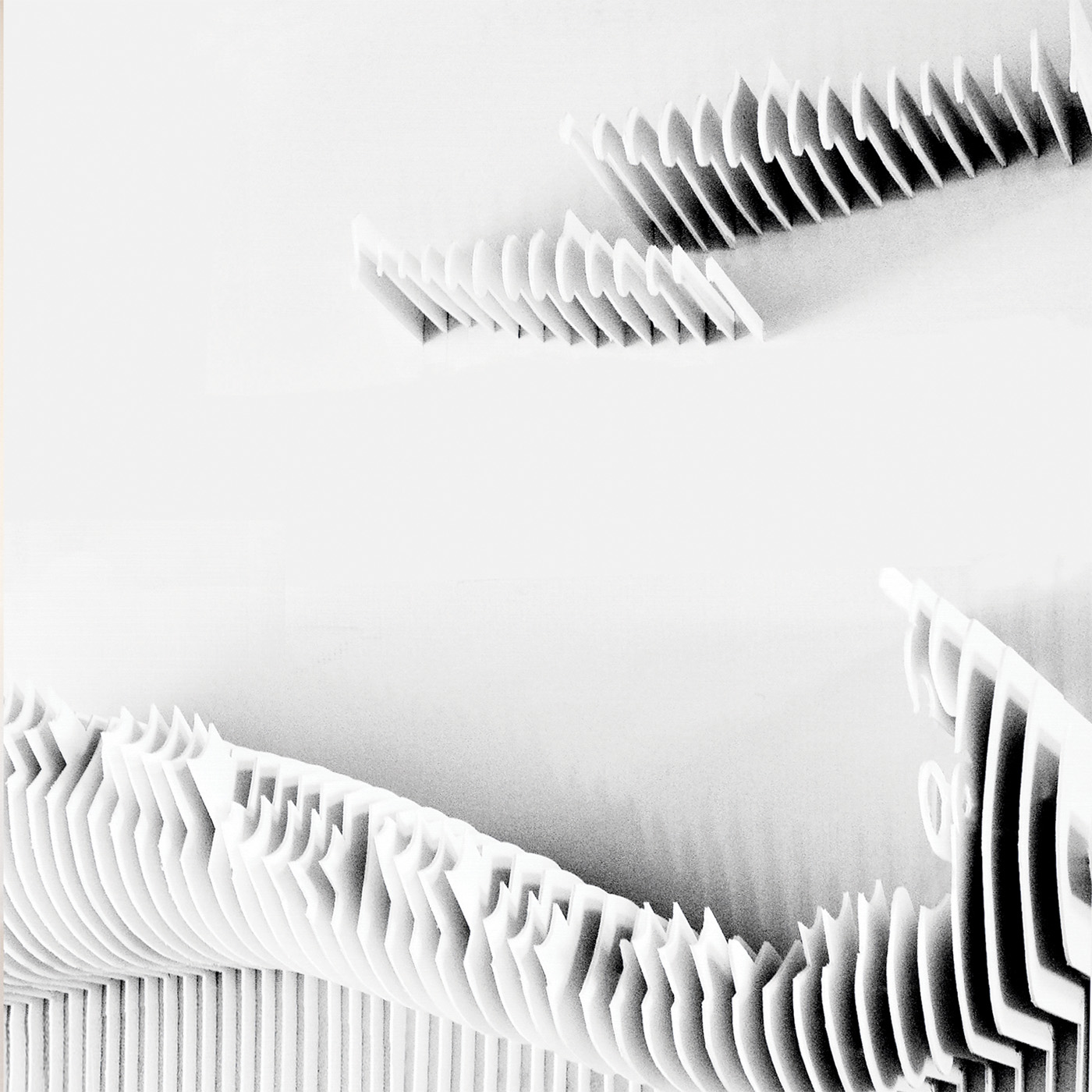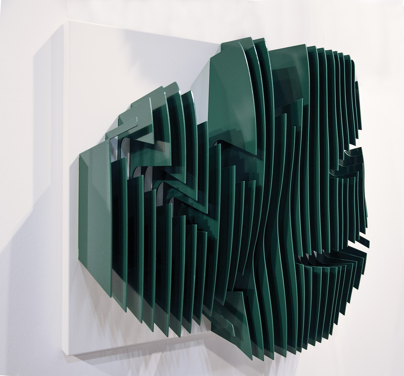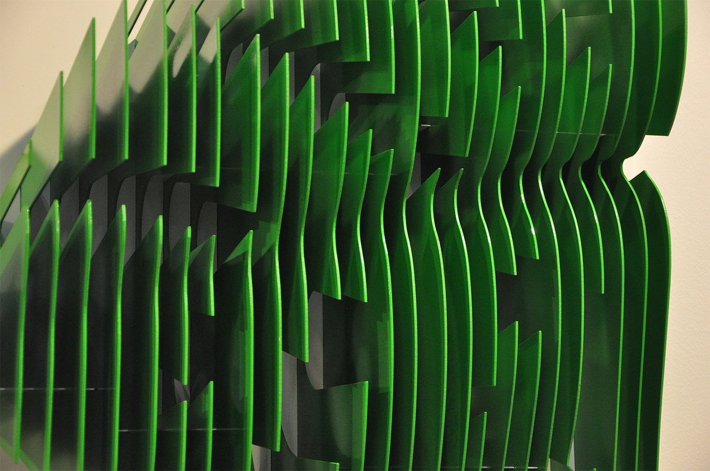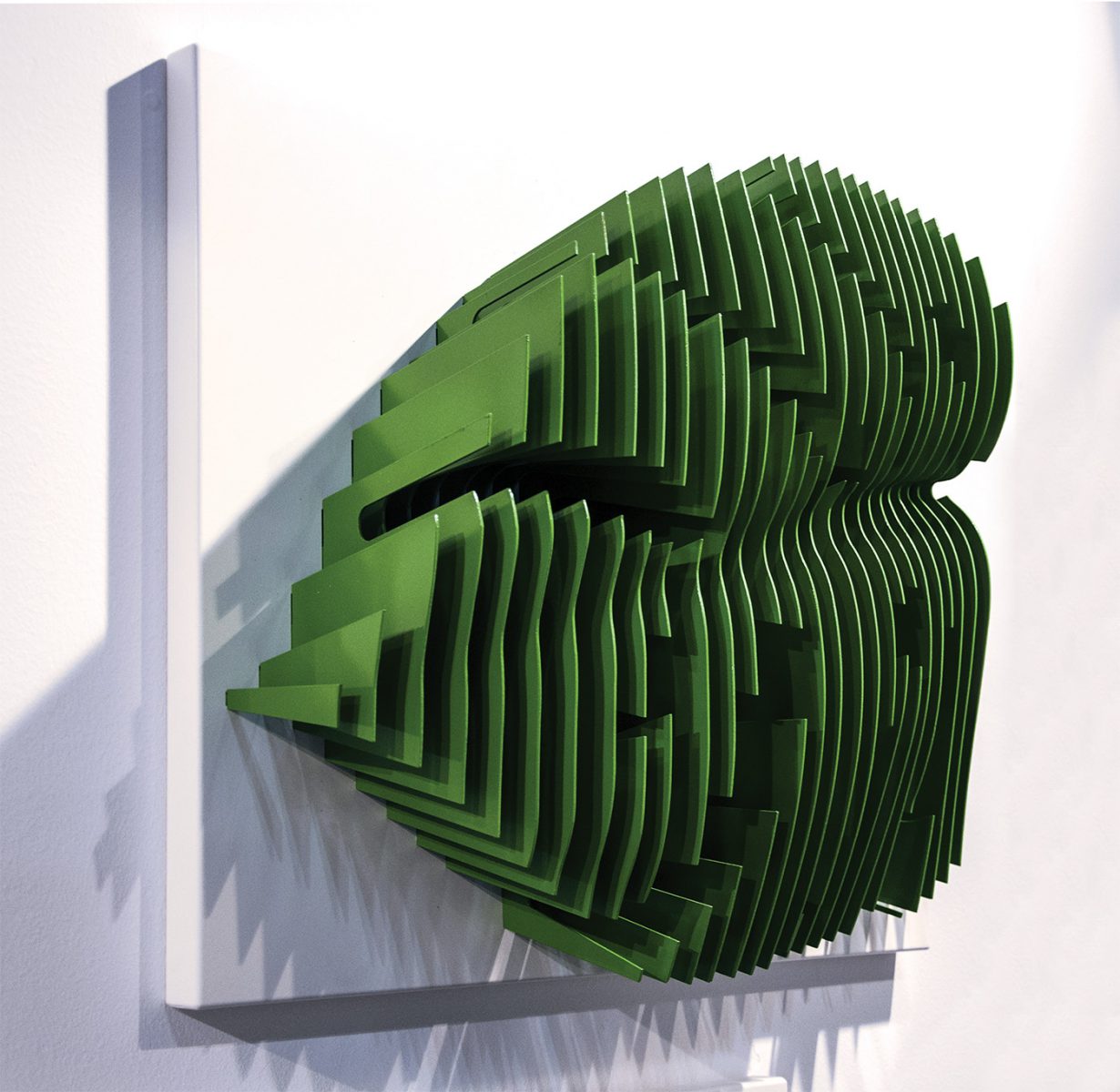 Vengono tagliate a laser una serie di sezioni, fissate al piano di fondo, faranno da appoggio ai libri e che comporranno un elemento tridimensionale che “viene fuori dal muro”, arricchendo la parete di un gioco di colori e di profondità