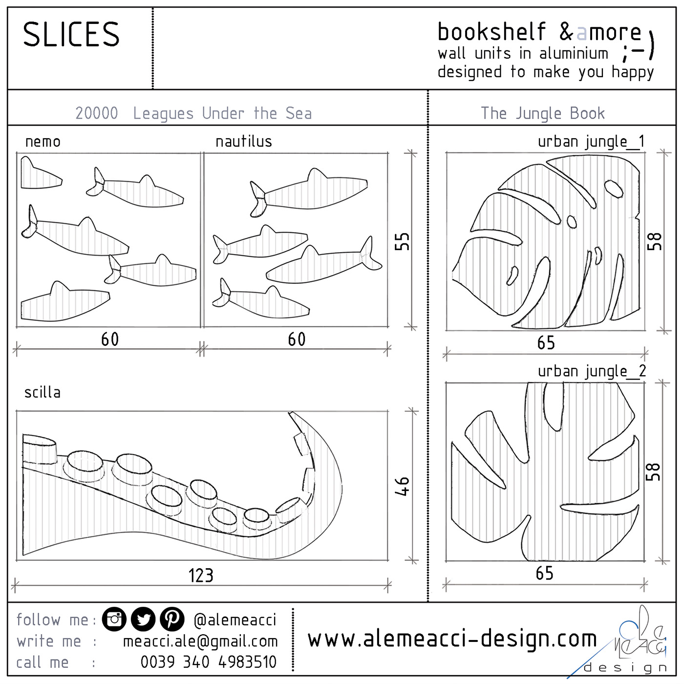"Slices" sono dei moduli da parete che reinterpretano la classica mensola per i libri, trasformandola in un elemento tridimensionale decorativo ispirato al mondo dell’avventura e della natura