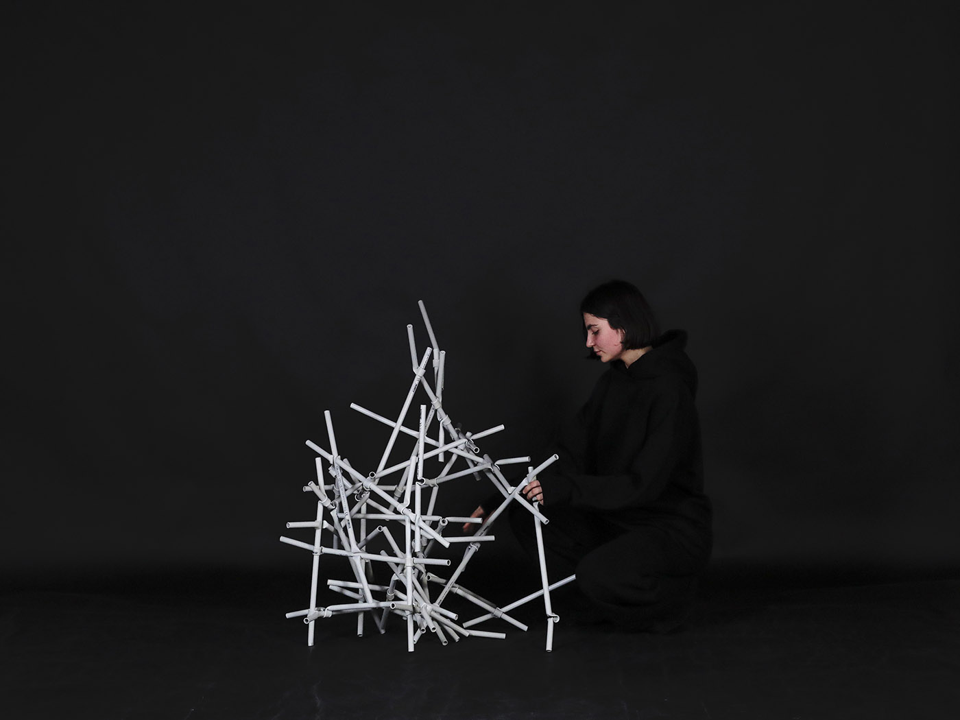 Sotto la guida del docente Mauro Cazzaro (Kanz architetti) e dell’assistente alla didattica Gianfranco Vasselli, gli studenti del laboratorio effettuano diverse sperimentazioni con elementi tubolari rigidi in PVC: realizzano 20 modelli che seguono in dinamismo del corpo umano, che diventa unità di misura dello spazio stesso, dando vita a geometrie sempre diverse