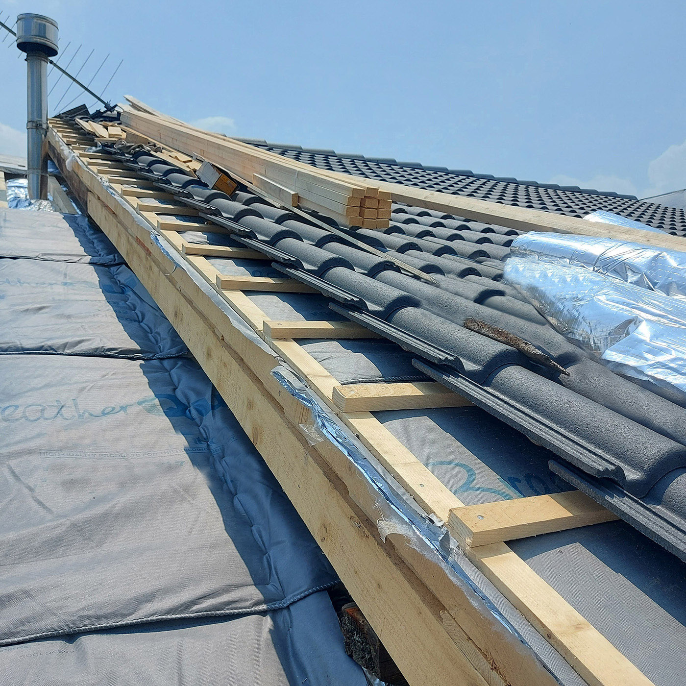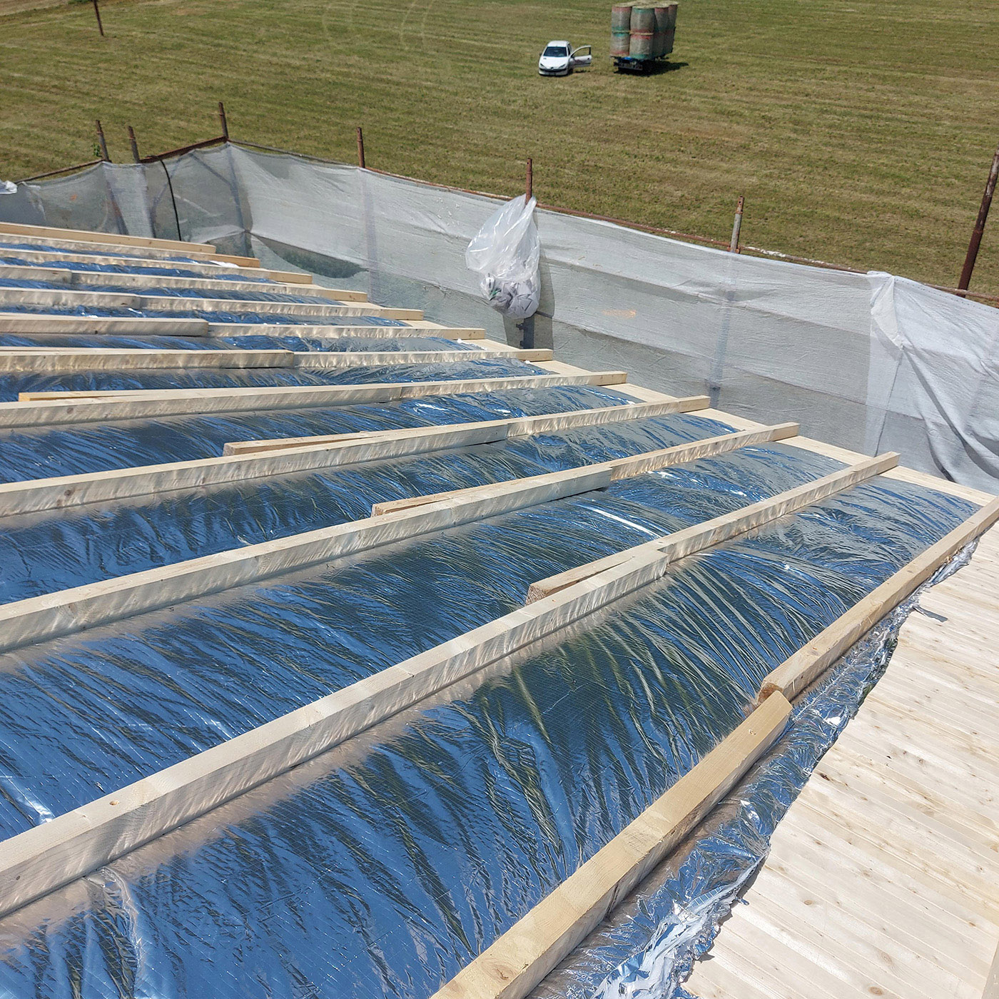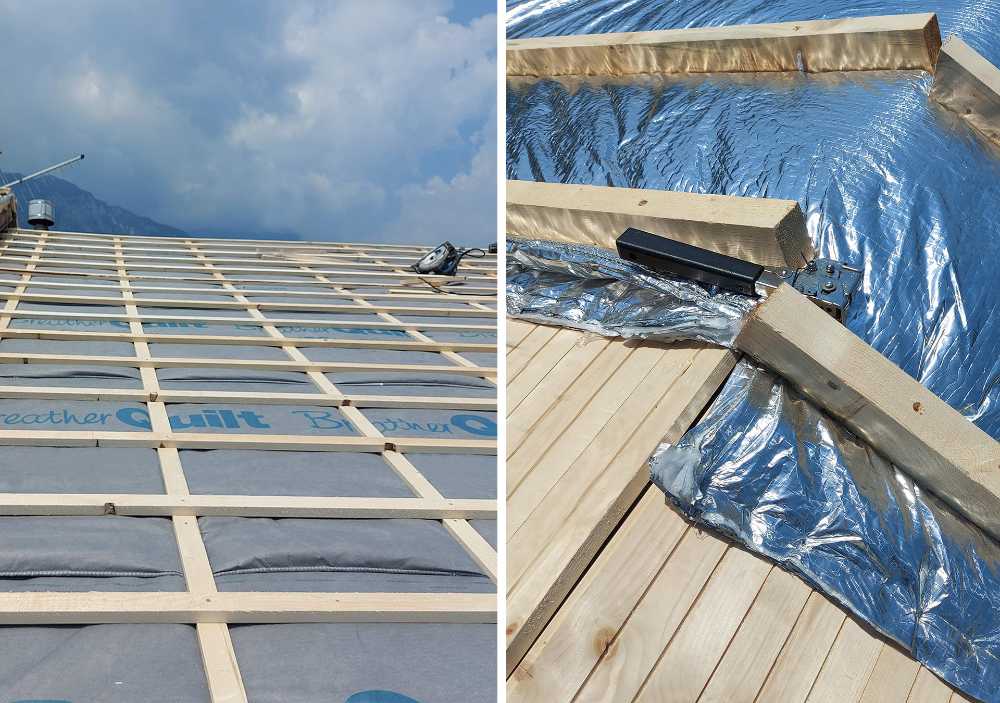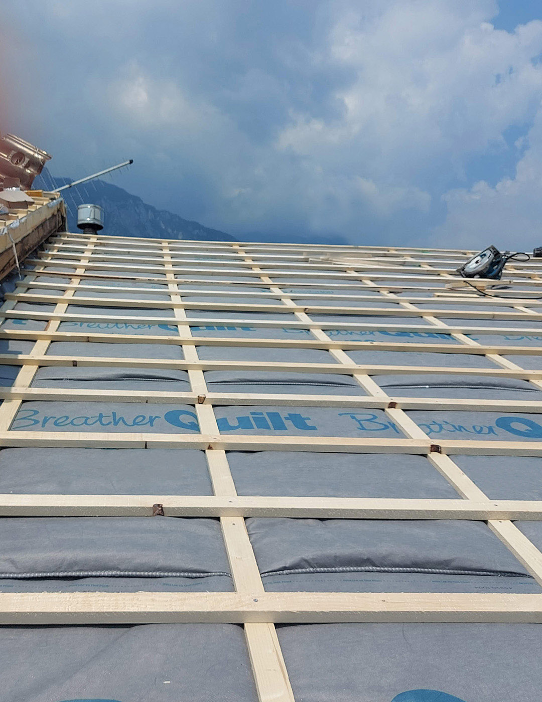 Le esigenze progettuali, nel caso specifico, erano quelle di raggiungere i valori di trasmittanza termica richiesti per il Superbonus del 110%, contenere lo spessore del pacchetto isolante poiché adiacente ad un altro edificio ed evitare di aumentare il peso della copertura in quanto sono stati mantenuti l’assito e le travi esistenti. Questa soluzione prevede la posa di un doppio strato di Over-foil Multistrato 19 Super Quilt* e uno strato di Over-foil Breather Quilt 11*