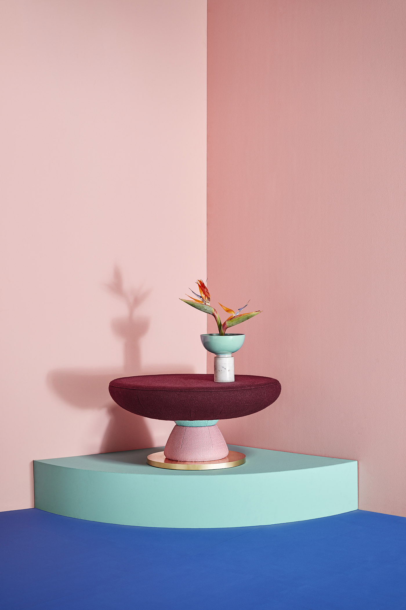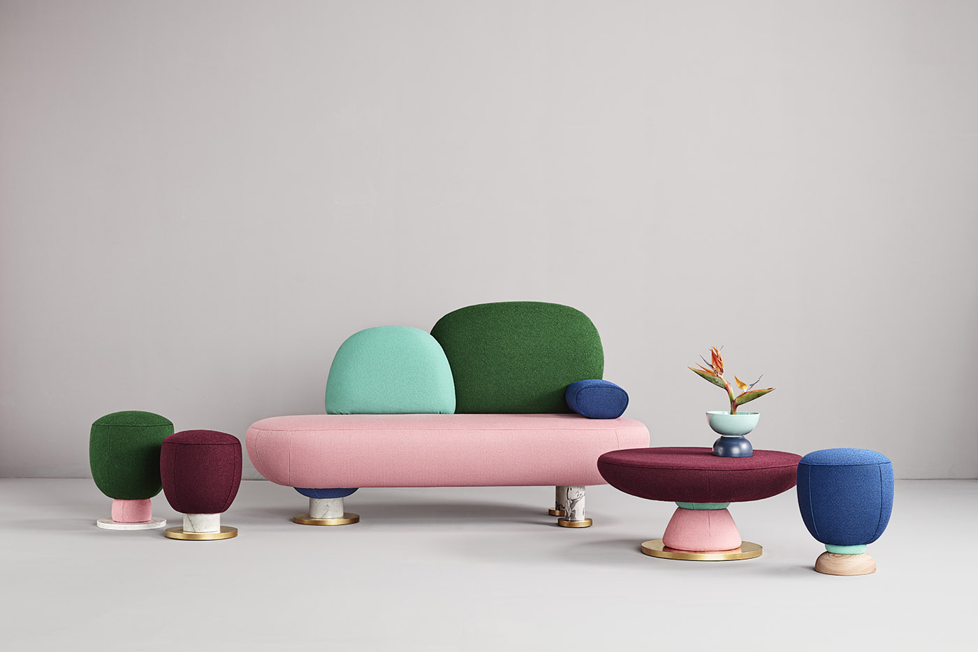 Disegnata per il marchio Missana, la collezione Toadstool è composta da un tavolo basso, puff di due dimensioni diverse e un sofà “a panca”; Masquespacio si diletta nell’utilizzare forme stilizzate e enfatizzate, riuscendo grazie all’accostamento dei materiali a esaltare i tessuti del brand