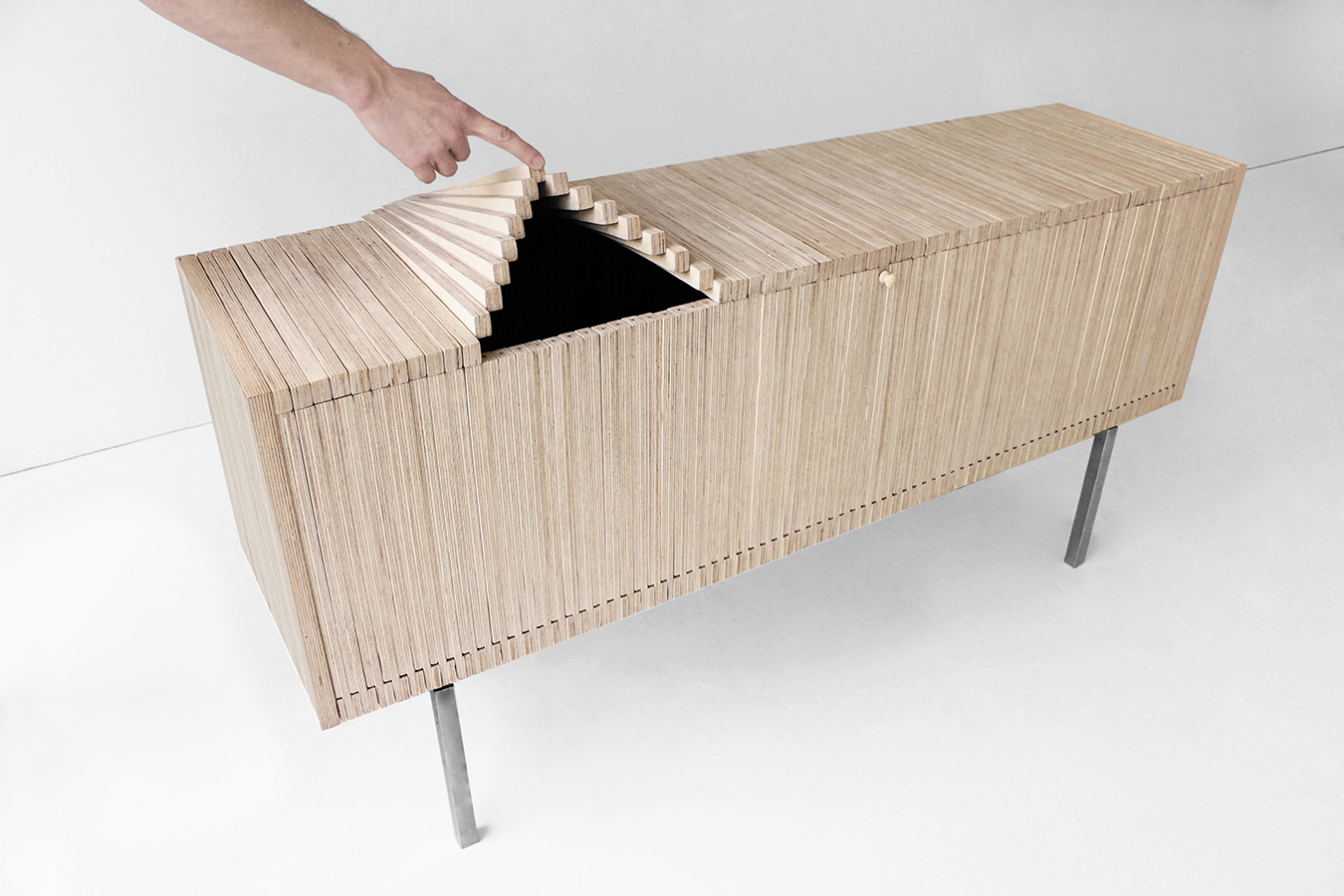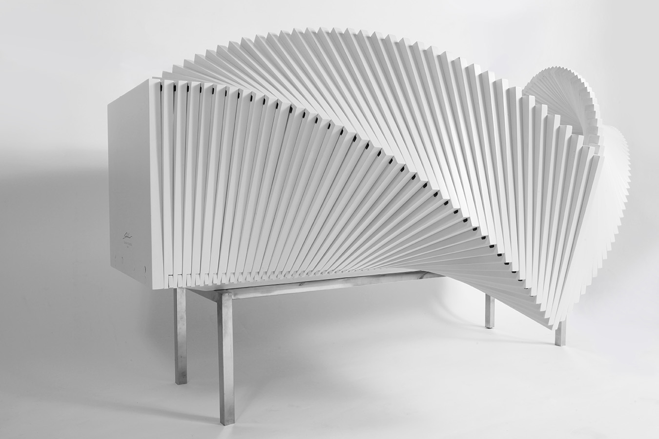 Il mobile Wave si apre con vera delicatezza e bellezza, ogni singola lamella si apre come una ventaglio di carta. Con molteplici configurazioni che consentono varie opzioni di apertura, l'artista ha riprogettato il processo di apertura e chiusura, simulando oggetti rotanti e ondeggianti