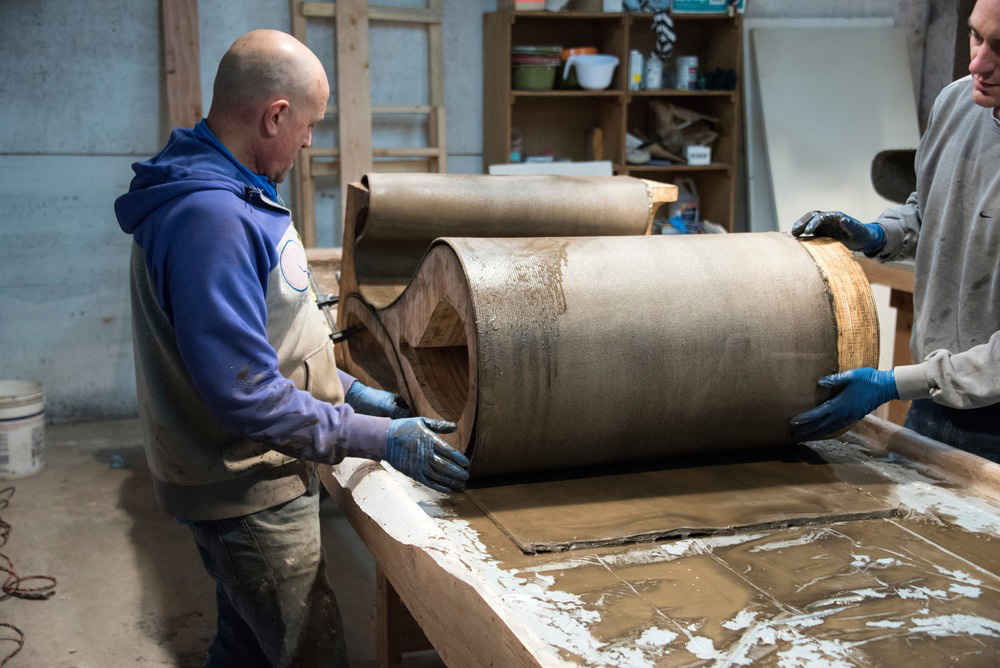 L'innovativa consolle è realizzata in Concrete Canvas, un tessuto impregnato di cemento brevettato usato raramente nella progettazione di mobili.. Concrete Canvas è un nuovo materiale che consente di utilizzare il calcestruzzo in modi radicalmente innovativi. Il tessuto flessibile impregnato di cemento indurisce sull'idratazione per formare uno strato di cemento sottile, resistente, impermeabile e resistente al fuoco - in sostanza, è un panno di cemento su un rotolo. È stato utilizzato per realizzare rifugi rapidamente dispiegabili, in particolare in situazioni di calamità, nonché per il controllo dell'erosione e il rivestimento del fossato. Riduce l'impatto ambientale delle applicazioni in calcestruzzo fino al 95%