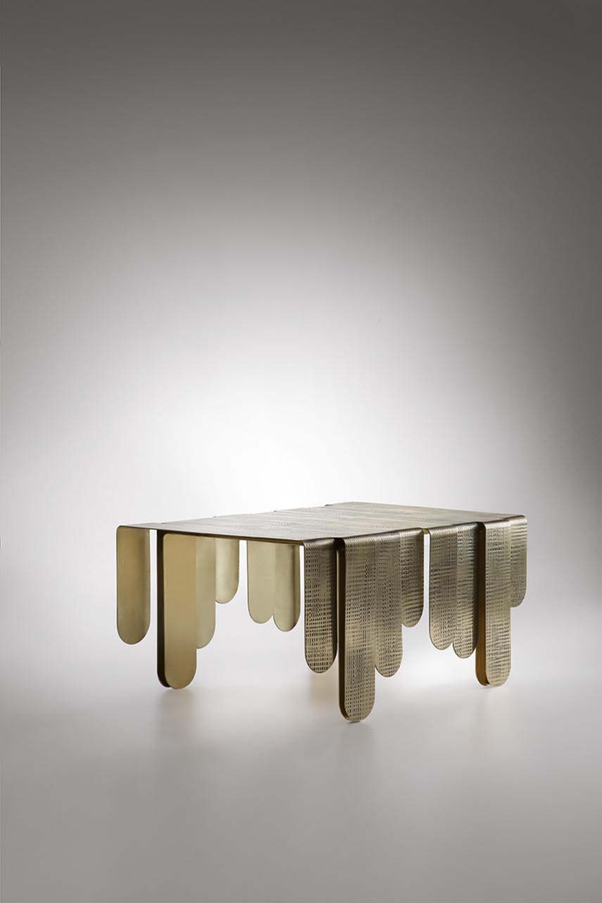 ll tavolino Xilo, disegnato da Delineo per De Castelli, è composto da lastre in ottone in spessore, stondate alle estremità e di diverse lunghezze, piegate e accostate con irregolarità per creare un movimento ritmato e armonico che si fonde con la struttura portante. Ogni elemento presenta una distintiva trama di impronte che si dissolvono in un delicato degradé di segni, in contrasto con la superficie levigata del metallo