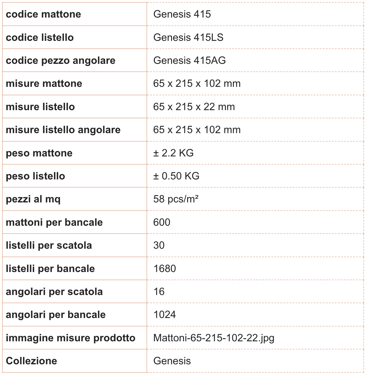 Genesis 415 appartiene alla linea Genesis, che propone mattoni fatti a mano, anticati ed estrusi. Disponibile nei formati pieno, listello e angolare, offre soluzioni versatili per dare vita a progetti sia indoor che outdoor, con massima libertà compositiva.