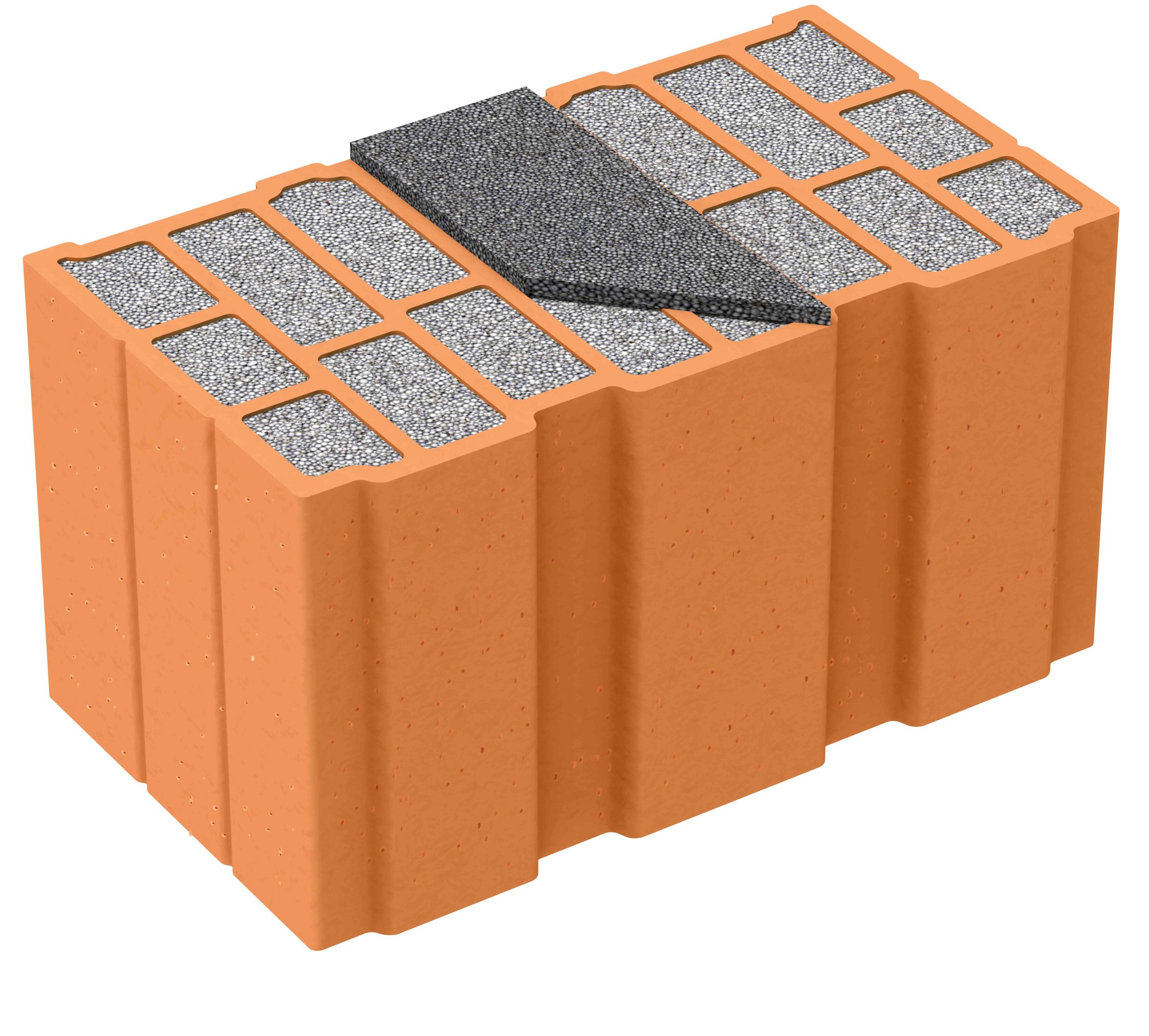 Blocco in laterizio porizzato con fori saturati di polistirene additivato di grafite Neopor® prodotto da BASF, dotato di incastro verticale a secco e foratura superiore al 60%.