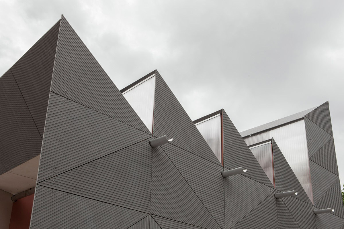 Flessibilità e apertura verso l’esterno, questi sono stati i due cardini che hanno guidato la progettazione dell’edificio. Nasce così un’architettura aperta e moderna che alterna grandi vetrate a tamponamenti in lastre di fibrocemento.