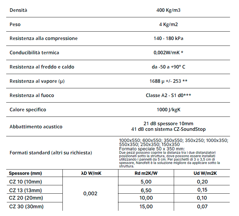 CZ è considerato uno degli isolanti più sottili e performanti disponibili sul mercato. Con una conducibilità termica λD pari a 0,002 W/mK, offre prestazioni isolanti fino a 20 volte superiori rispetto ai pannelli tradizionali. Il prodotto è inoltre ecosostenibile, realizzato con materiali riciclati e riciclabili a fine vita, conforme alla norma UNI/PdR 88:2020 e ISO 14021. Garantisce inoltre classe di reazione al fuoco A2-s1 d0, assicurando elevati standard di sicurezza.