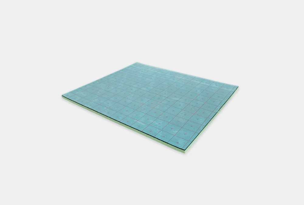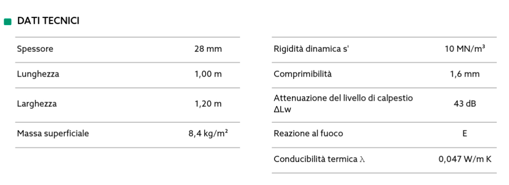Il pannello ha uno spessore complessivo di circa 28 mm ed è composto da uno strato in gomma ad alta densità e uno in fibra poliestere, garantendo un’elevata attenuazione del rumore da calpestio (ΔLw fino a 43 dB). Il lato superiore è dotato di un sistema di fissaggio che facilita la posa del riscaldamento a pavimento, ottimizzando tempi e prestazioni del sistema.