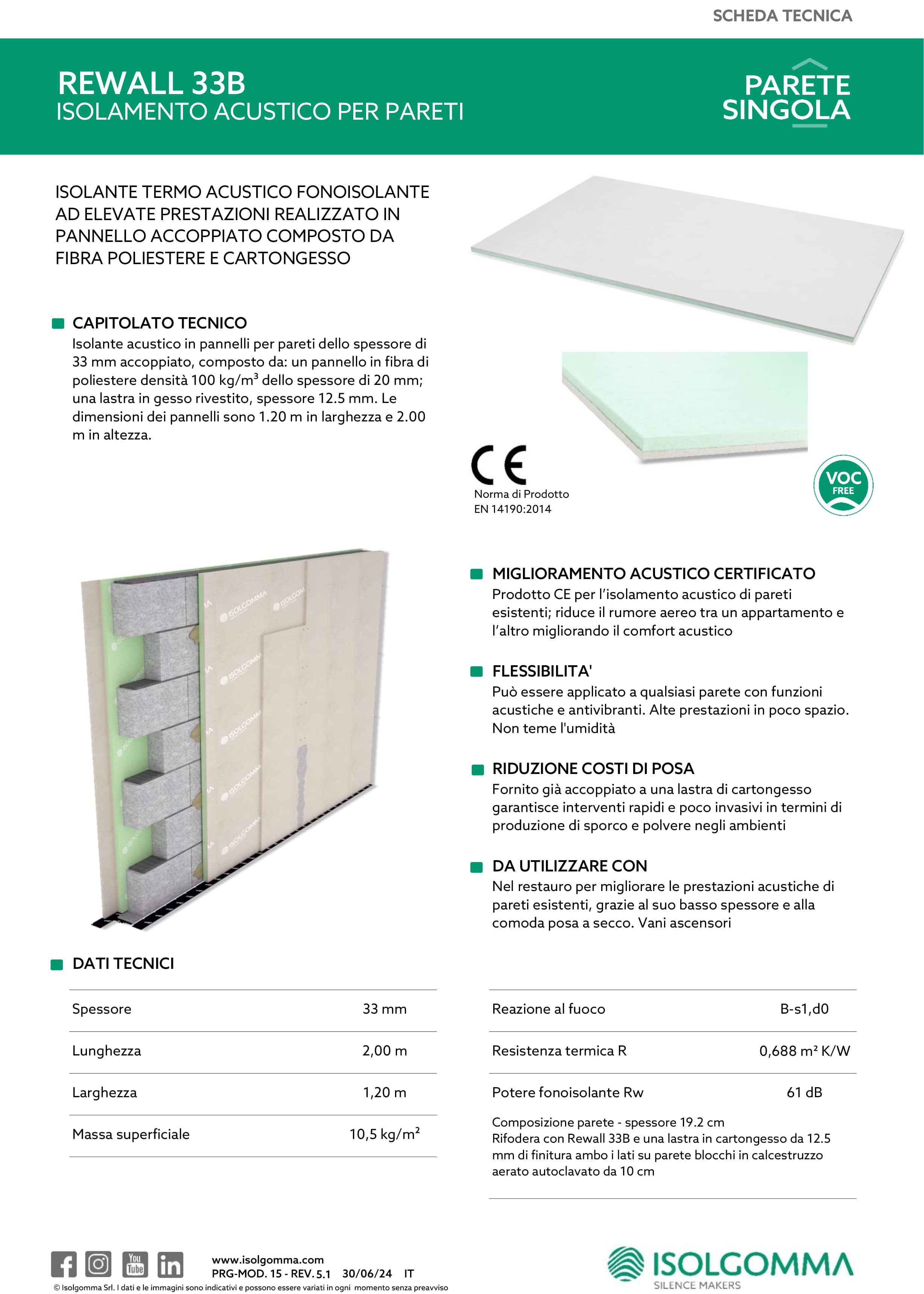 I pannelli dell'isolante acustico hanno uno spessore di 33 mm, risultato di un pannello in fibra di poliestere densità 100 kg/m³ dello spessore di 20 mm accoppiato ad una lastra in gesso rivestito, dello spessore 12.5 mm..