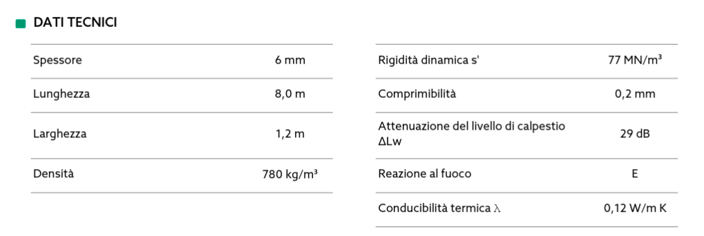 Con uno spessore di soli 6 mm e una densità di circa 780 kg/m³, SYL 6AD garantisce elevate prestazioni anche in spazi limitati. La struttura in fibre e granuli di gomma pressati a caldo, accoppiata a un supporto in tessuto non tessuto, assicura resistenza meccanica, stabilità e durabilità nel tempo.