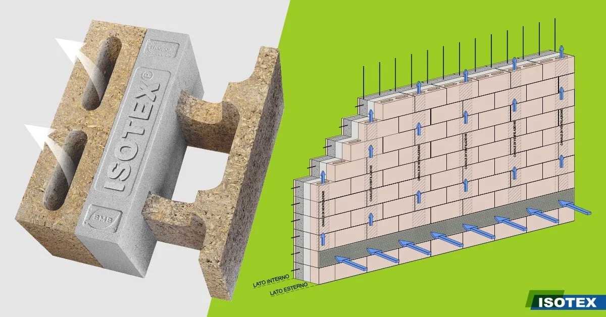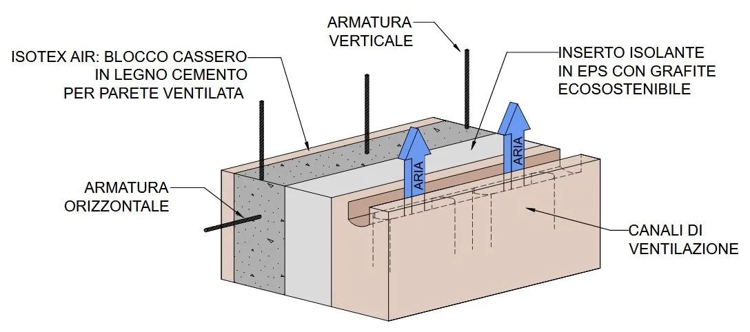 Il blocco ventilat Isotex AIR rappresenta un'innovazione nel campo della costruzione, offrendo un sistema unico sul mercato e brevettato per realizzare pareti perimetrali con ventilazione integrata nel blocco cassero. Questa tecnologia modernizza il concetto tradizionale dei blocchi cassero in legno cemento, introducendo un design che permette l'installazione in una sola fase di posa di pareti debolmente armate e ventilate, insieme all'isolamento termico. L'uso dell'EPS con grafite, racchiuso dal legno cemento, ottimizza ulteriormente l'isolamento, mentre elementi speciali del sistema eliminano i ponti termici e acustici, migliorando il comfort abitativo.