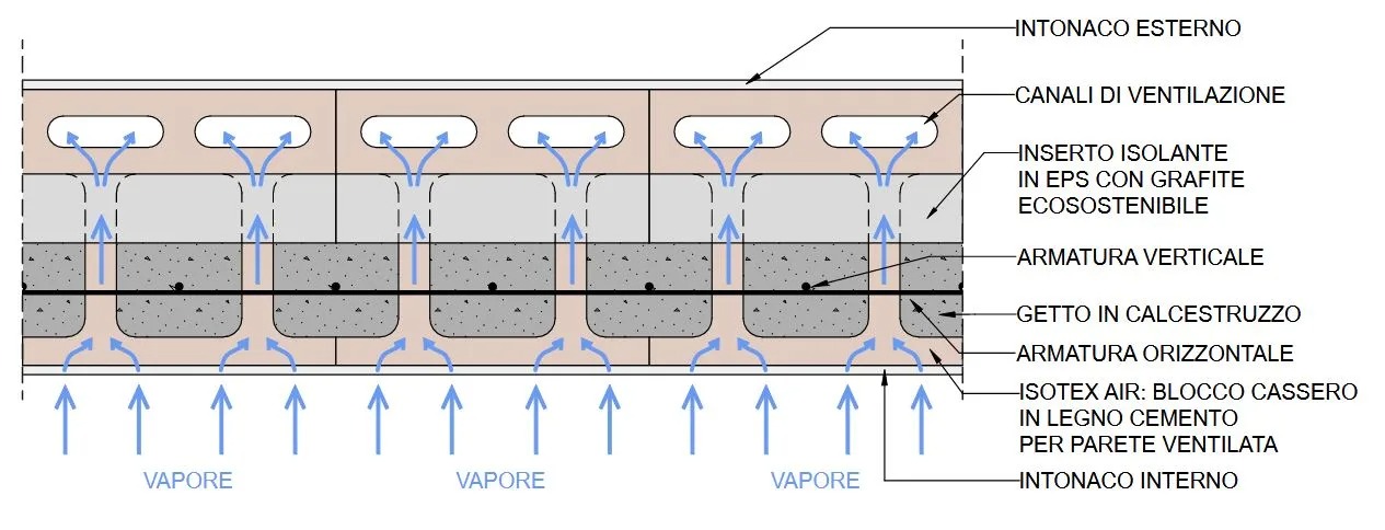 La composizione della parete ventilata Isotex AIR inizia con un rivestimento in legno cemento, che funge da barriera protettiva per la struttura in calcestruzzo armato interna e per l'isolamento. All'interno dei blocchi, si inseriscono armature orizzontali e verticali, che vengono poi riempite con calcestruzzo seguendo specifiche normative. L'isolamento è garantito da un inserto in EPS con grafite made of Neopor® BMBcert di BASF, prodotto con precisione millimetrica per assicurare continuità all’isolamento e altissime performance termiche. La geometria dei blocchi è stata adattata per facilitare la creazione di canali di ventilazione, che contribuiscono al raffrescamento naturale della struttura durante i mesi caldi.