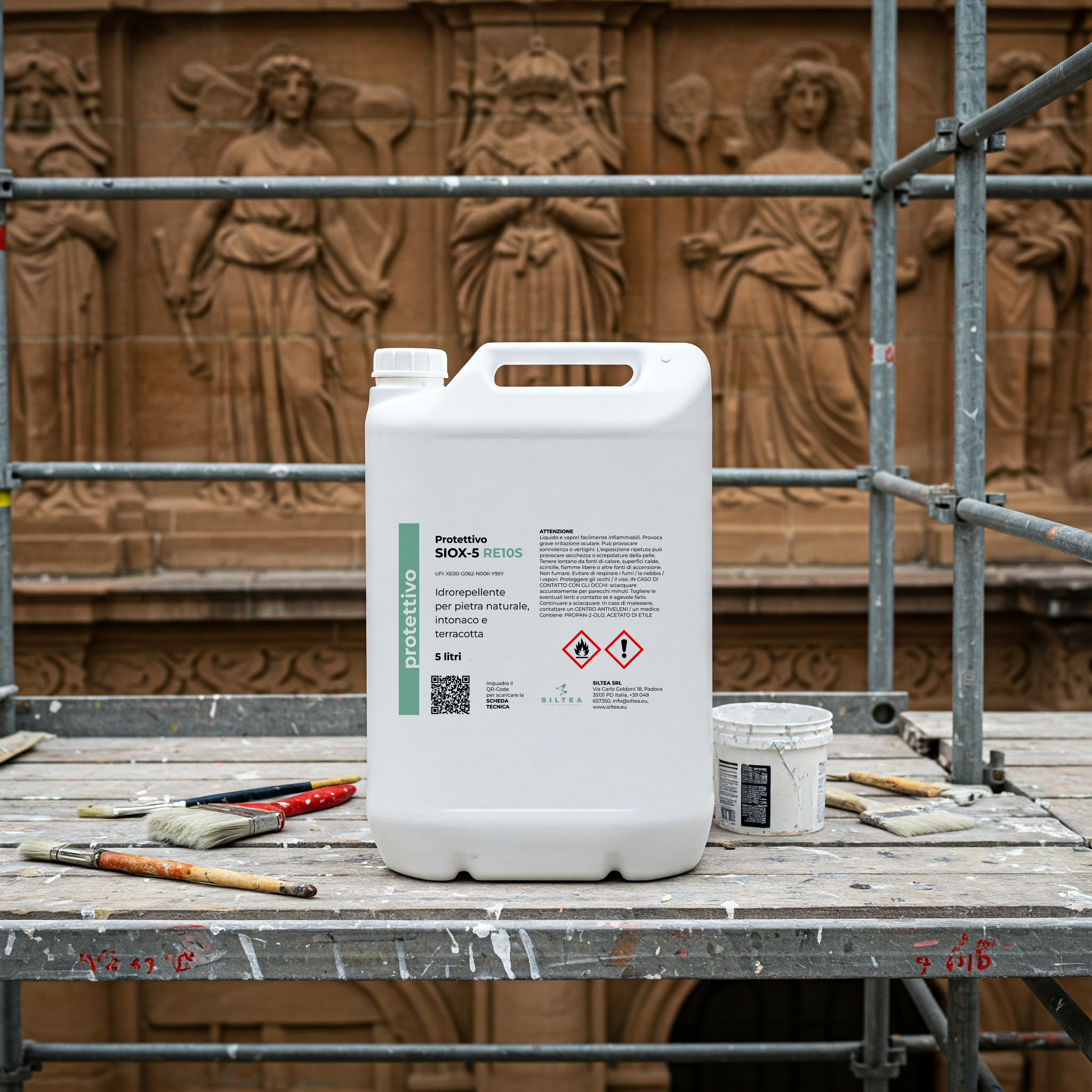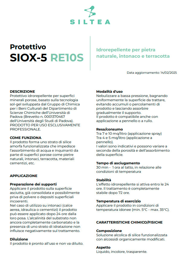 SIOX-5 RE10S è un trattamento idrorepellente professionale a base di silice nanostrutturata funzionalizzata, sviluppato con tecnologia sol-gel brevettata dall'Università di Padova.
