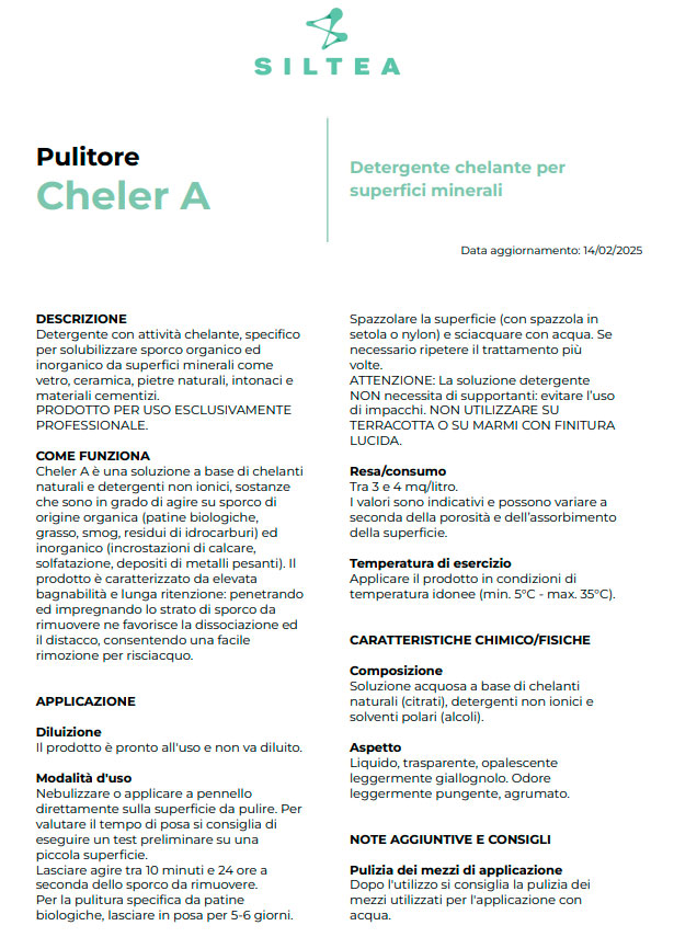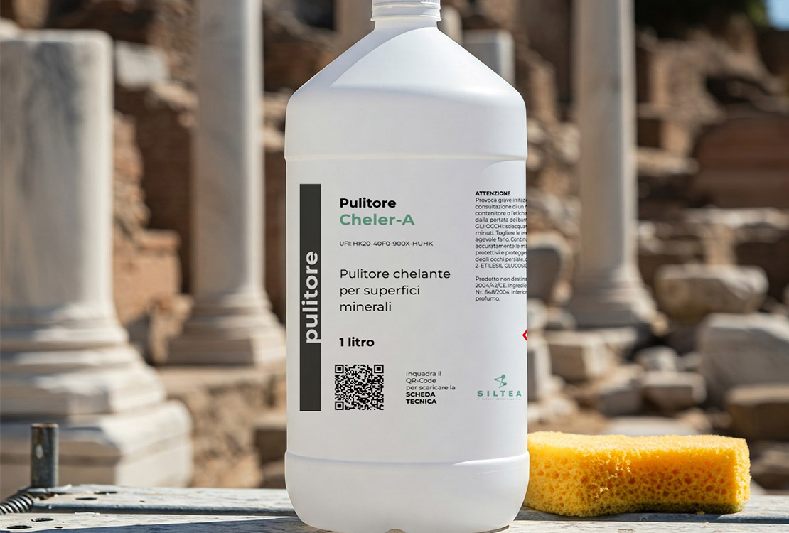 CHELER-A è un detergente ad azione chelante specificamente formulato per rimuovere sporco organico e inorganico da superfici minerali delicate.